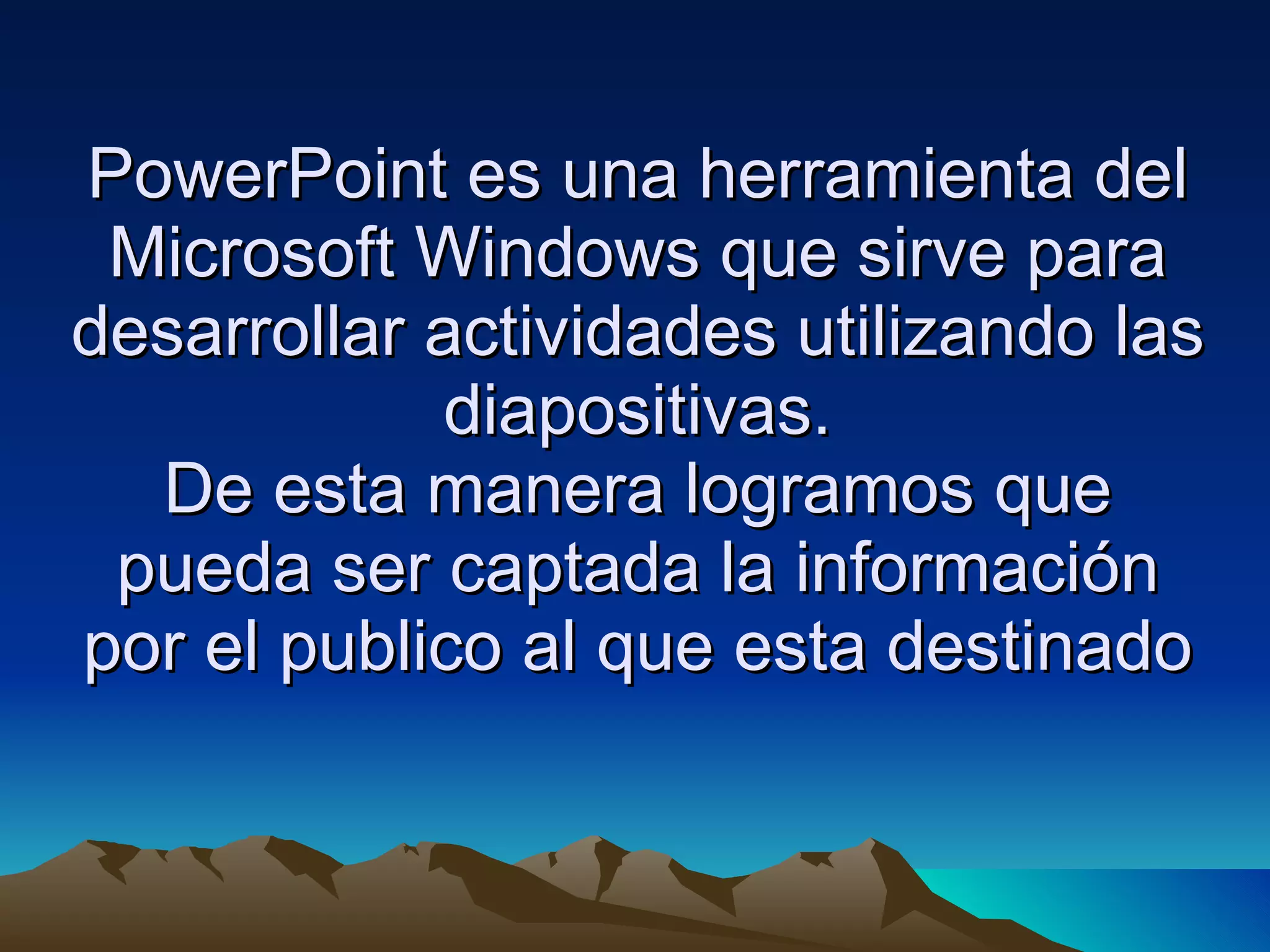 PowerPoint es unaherramienta del Microsoft Windows que sirve para desarrollar actividades utilizando las diapositivas. De esta manera logramos que pueda ser captada la información por el publico al que esta destinado