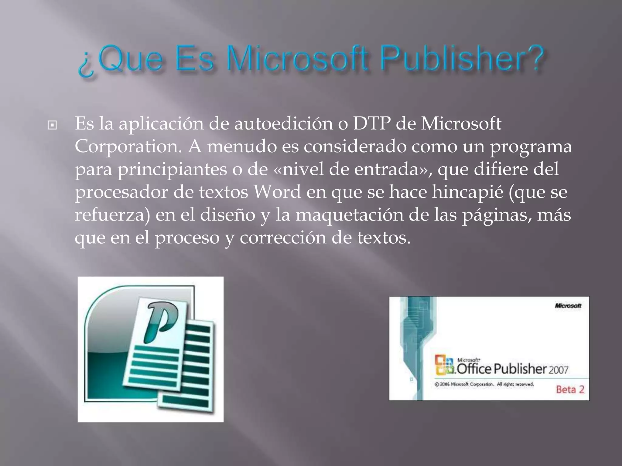 Microsoft Publisher es un programa de autoedición o diseño de páginas (DTP) que se enfoca en el diseño y maquetación de páginas más que en el procesamiento de texto como Word. Proporciona plantillas e instalaciones para crear una variedad de publicaciones de forma sencilla como boletines, folletos y sitios web. A diferencia de otros programas profesionales de diseño, Publisher está dirigido a usuarios principiantes y produce publicaciones de calidad casera en lugar de publicaciones profesionales.