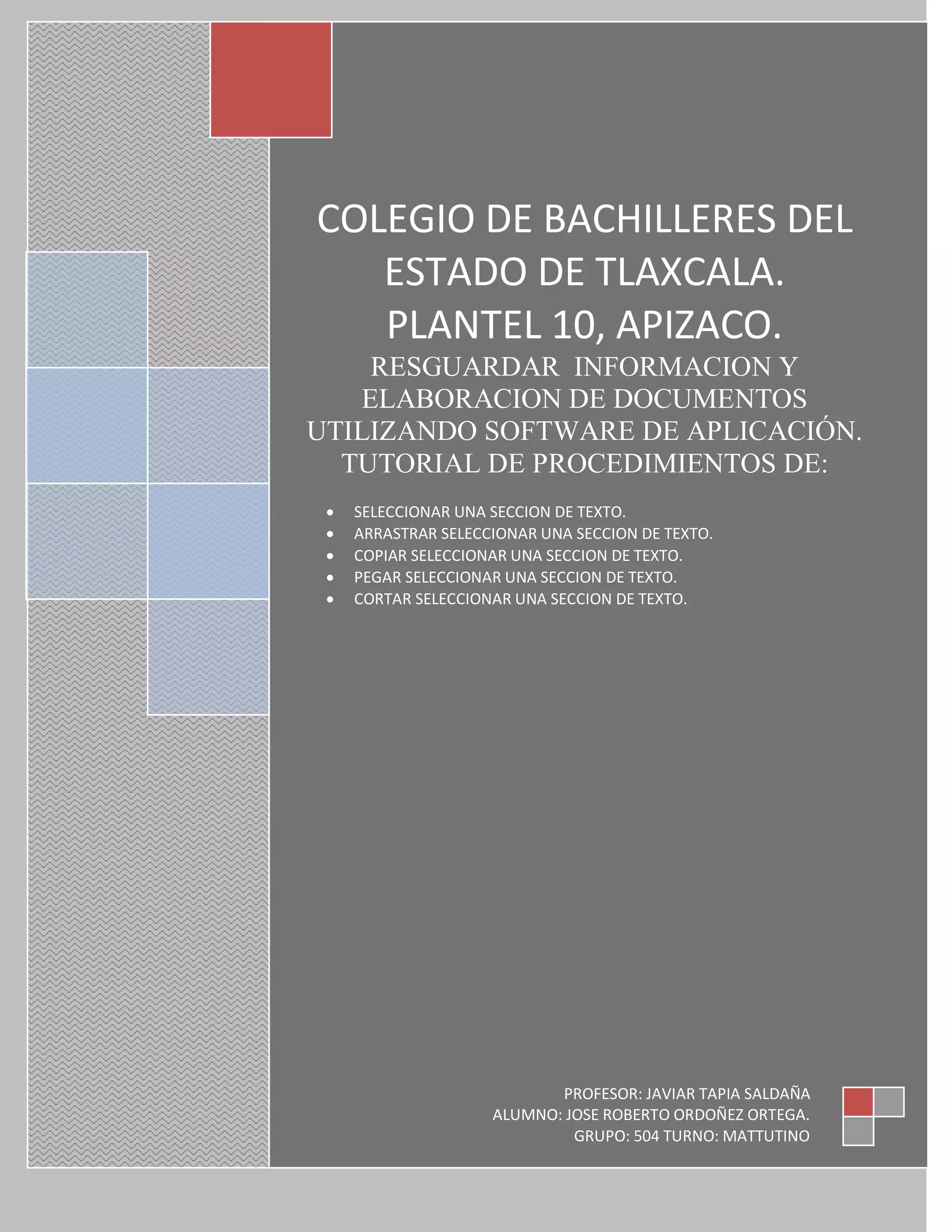 El documento proporciona instrucciones sobre cómo seleccionar, arrastrar, copiar, pegar y cortar secciones de texto utilizando software de aplicación, incluyendo los pasos para cada operación y las combinaciones de teclas correspondientes. Explica cómo seleccionar texto haciendo clic y arrastrando el mouse o presionando teclas de control y flechas, y cómo copiar, cortar y pegar texto mediante los menús o combinaciones de teclas como Control-C, Control-V y Control-X.