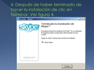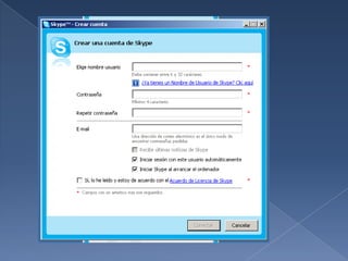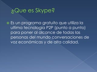 Este documento describe los requisitos del sistema y cómo descargar e instalar el software Skype. Skype es un programa gratuito que usa tecnología P2P para proporcionar llamadas de voz de alta calidad a bajo costo. Se recomienda tener Windows XP, 1 GHz de procesador, 256 MB de RAM y conexión de banda ancha para aprovechar todas sus funciones. Una vez descargado, el usuario crea una cuenta y puede añadir contactos para chatear o hacer llamadas de voz y video.