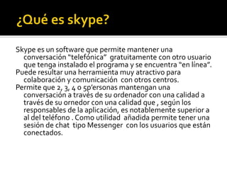 Este documento explica cómo usar Skype para comunicarse gratuitamente con otros usuarios. Skype permite llamadas y videollamadas de voz de alta calidad entre 2-5 personas. Los usuarios pueden descargar e instalar Skype de forma gratuita y crear una cuenta para añadir contactos y comunicarse.
