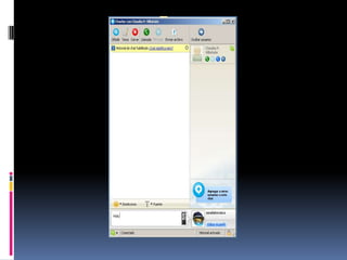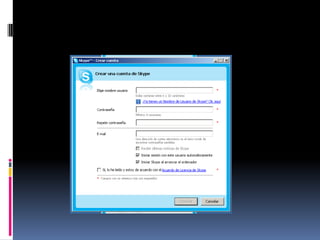 Este documento proporciona una guía sobre cómo usar el programa Skype. Explica que Skype es un programa gratuito que permite realizar llamadas de voz y chats a través de Internet. Detalla los requisitos mínimos y recomendados para usar Skype, así como cómo descargar, instalar y crear una cuenta de Skype. Además, muestra los pasos para agregar contactos, chatear, agregar personas a conversaciones existentes, realizar audio conferencias y videollamadas.