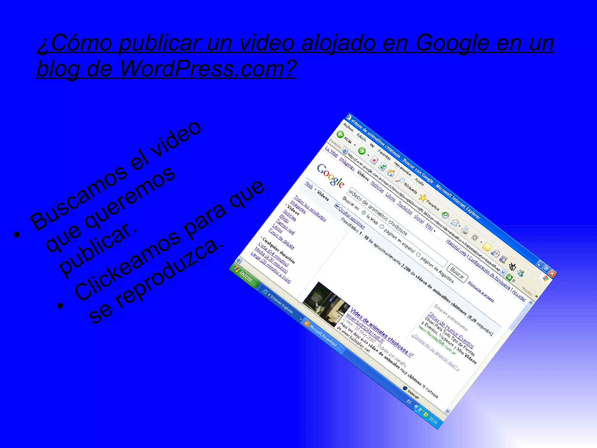 Este documento explica cómo publicar un video alojado en Google en un blog de WordPress.com en 3 pasos: 1) Buscar el video en Google y copiar el código embed; 2) Pegar el código en una nueva entrada de blog en WordPress asignándole una categoría; 3) Publicar la entrada para ver el video en el blog.