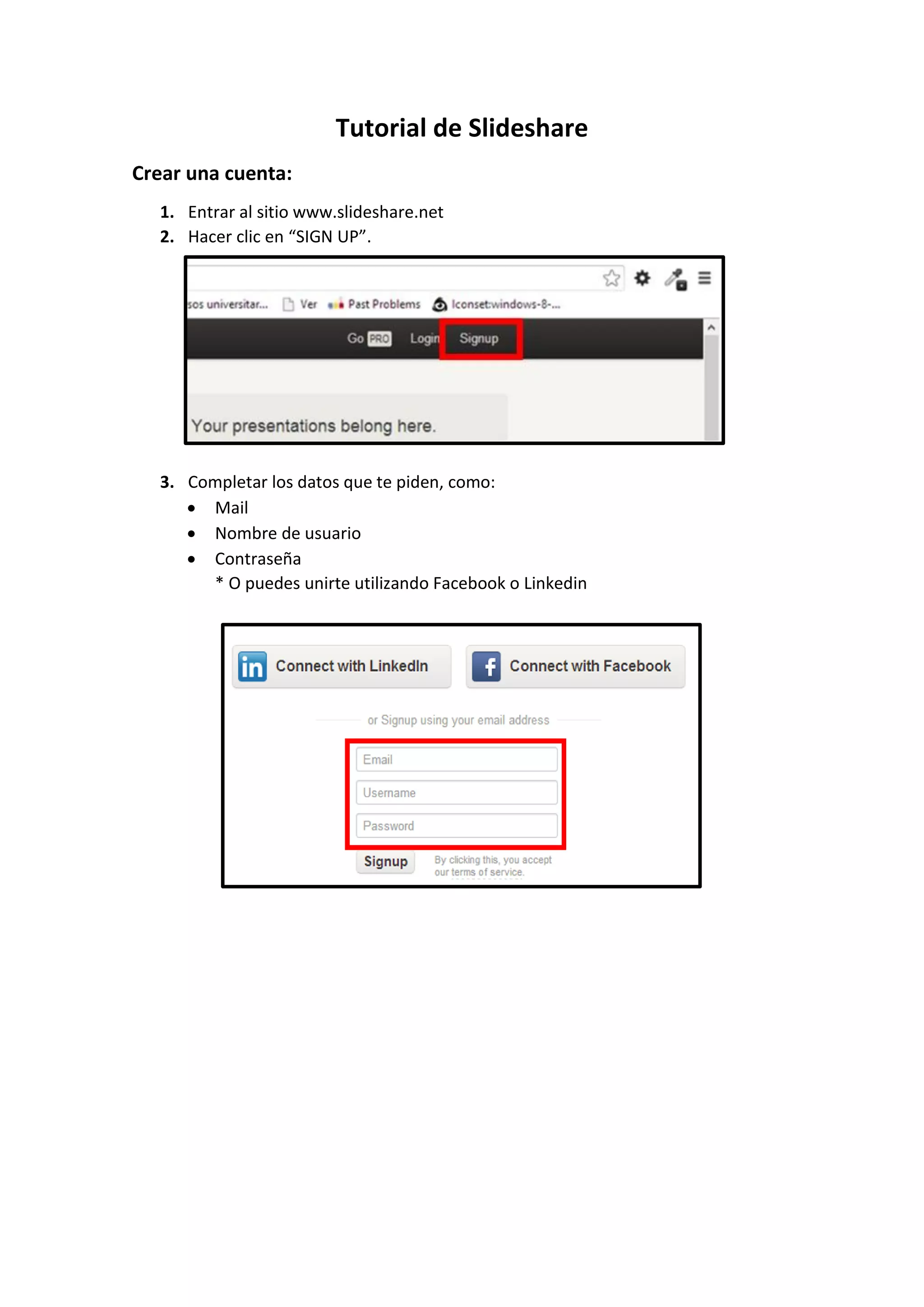 Este documento proporciona instrucciones sobre cómo crear una cuenta en Slideshare, subir presentaciones, editar perfiles y publicar presentaciones en un blog. Explica los pasos para registrarse en el sitio, completar los detalles de cuenta requeridos, y finalizar el proceso de registro haciendo clic en "Registrarse". También describe cómo cargar presentaciones al sitio seleccionando el archivo y llenando los metadatos requeridos, y cómo copiar el código HTML de Slideshare para publicar la presentación en un blog.