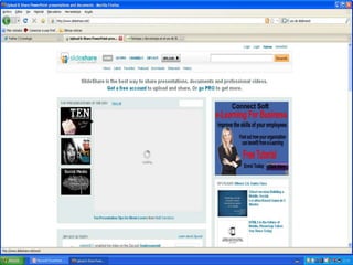 SlideShare es una aplicación web que permite almacenar presentaciones de diapositivas creadas en programas como PowerPoint y compartirlas a través de Internet. Esto facilita dar conferencias remotas y compartir trabajos con otros sin necesidad de enviar archivos pesados por correo. SlideShare convierte las presentaciones a formato Flash para que se puedan ver desde cualquier ordenador. Aunque es útil para compartir presentaciones, tiene limitaciones como no poder combinar sonido e imágenes, y que las presentaciones quedan estáticas al subirlas.