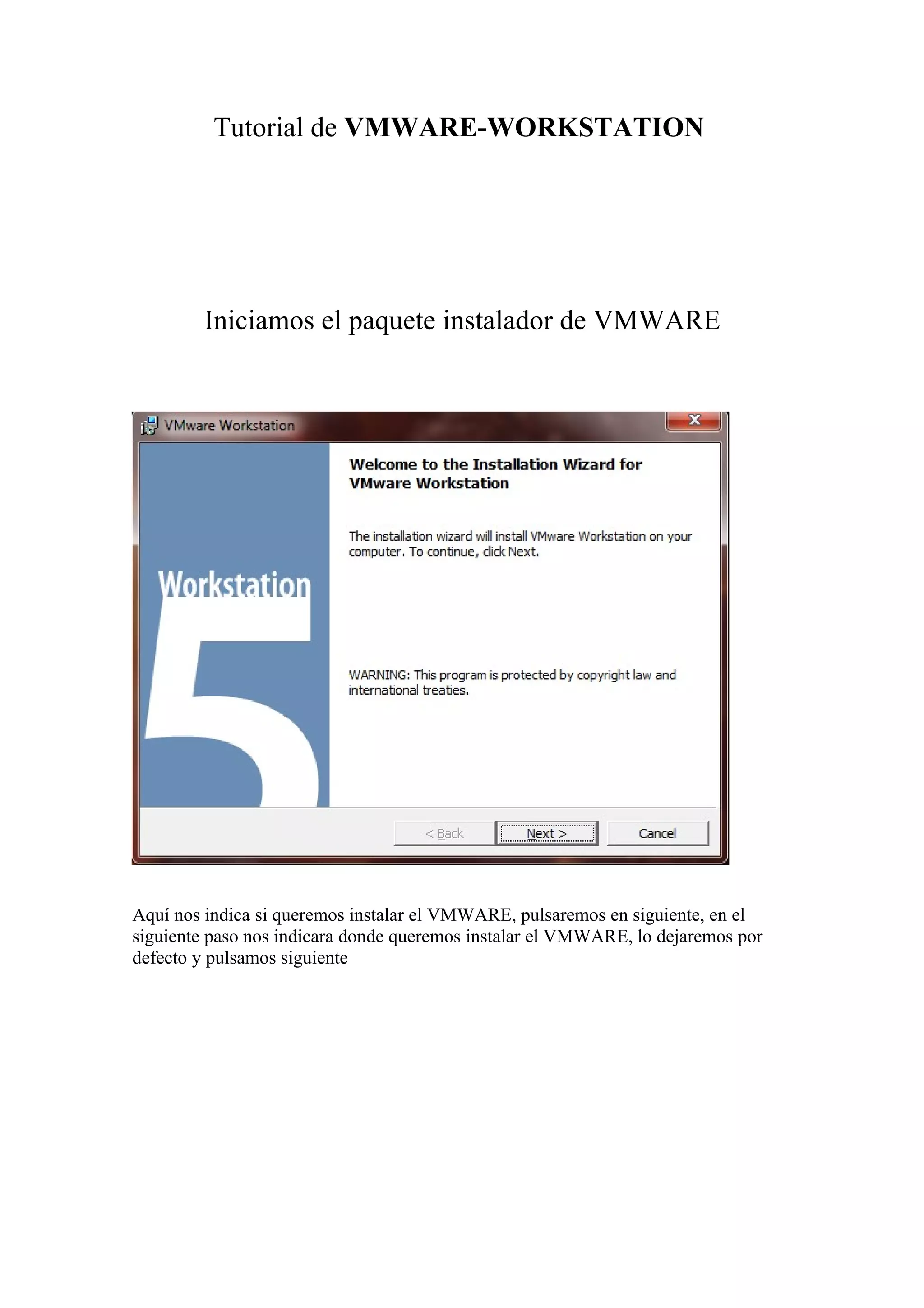 Este documento proporciona instrucciones para instalar VMware Workstation y crear una máquina virtual para instalar Windows XP de forma virtual. Explica los pasos para iniciar el instalador de VMware, seleccionar la ubicación de instalación, elegir las opciones de icono y CD-ROM, e iniciar la instalación. Luego, detalla cómo configurar una máquina virtual para usar una imagen ISO de disco y comenzar la instalación de Windows XP de forma virtual.