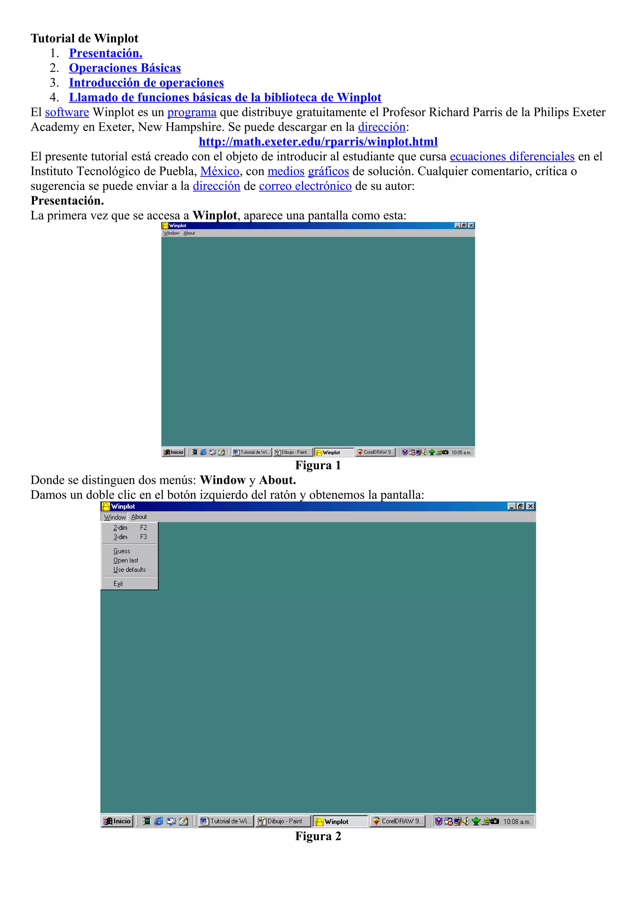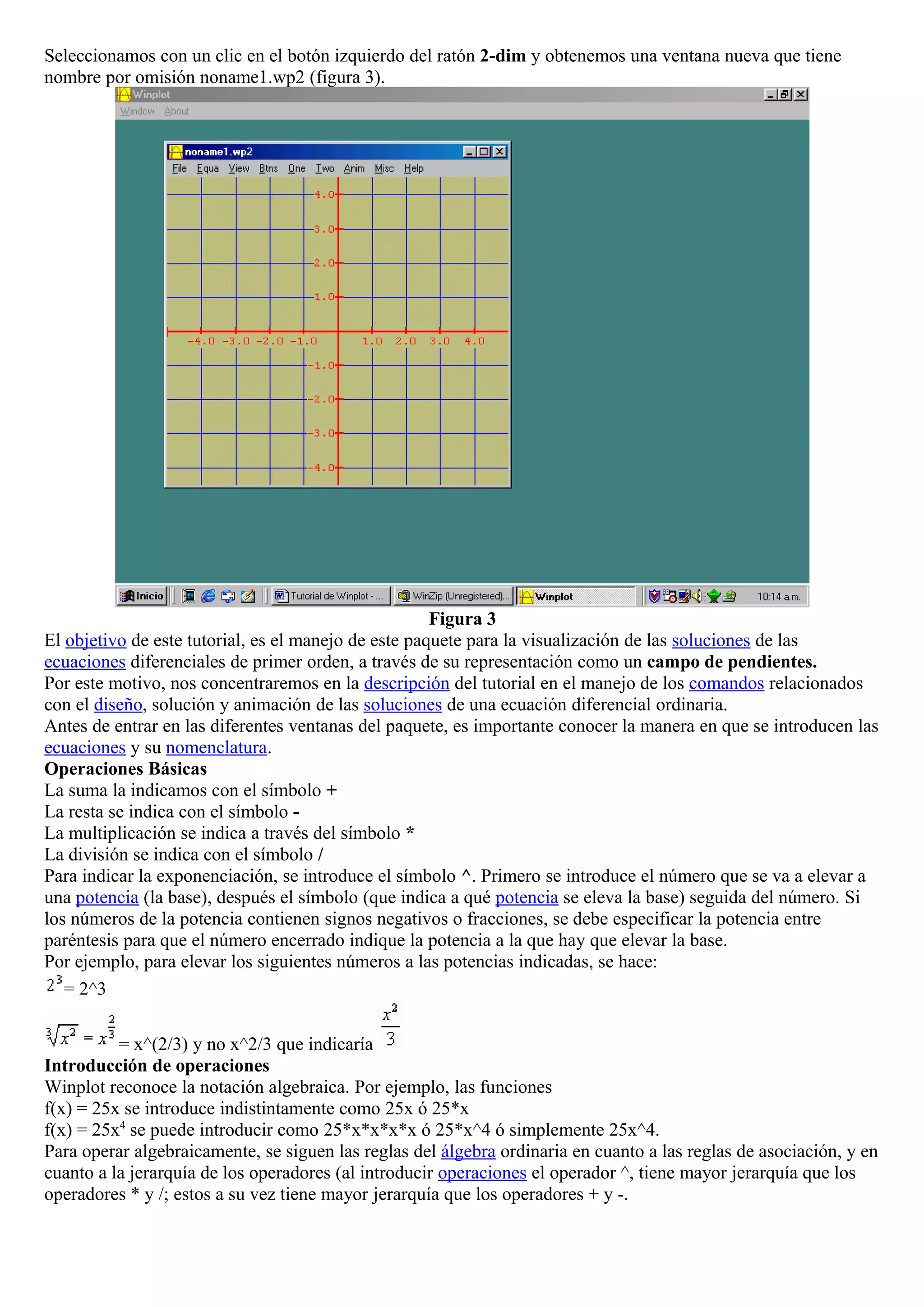 El documento presenta un tutorial sobre el uso del software Winplot para visualizar soluciones de ecuaciones diferenciales. Explica las operaciones básicas, la introducción de funciones y ecuaciones, y los menús y opciones del programa para representar gráficamente soluciones. El objetivo es que estudiantes de ecuaciones diferenciales en México puedan usar el software para resolver ecuaciones de forma gráfica.