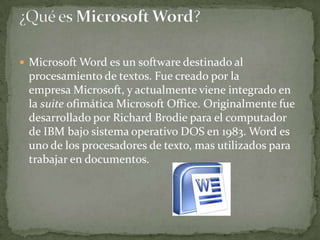 Microsoft Word es un software de procesamiento de texto creado por Microsoft que se usa comúnmente para crear y editar documentos. El tutorial explica cómo abrir y guardar archivos en Word, las diversas herramientas como la cinta de opciones, barras de desplazamiento e inserción de imágenes, y cómo revisar la ortografía y formato de texto. También cubre funciones básicas como zoom y guardado rápido.