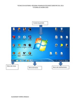 El documento proporciona una lista de las herramientas y funciones disponibles en Word 2010, incluyendo opciones de formato de texto, inserción de gráficos e imágenes, creación de tablas, edición y revisión de documentos, y configuración de páginas. El tutorial fue creado por Alexander Torres Orozco para estudiantes del segundo semestre del programa Técnico en Sistemas en Regional Risaralda en 2013.