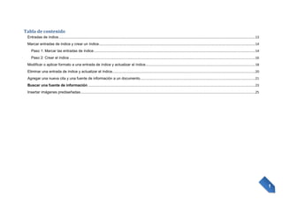 Este documento proporciona instrucciones sobre cómo crear un índice en Microsoft Word. Explica cómo marcar entradas de índice en el texto, incluidas palabras, frases y intervalos de páginas. Luego, describe cómo seleccionar un diseño de índice y generar el índice terminado, que ordena automáticamente las entradas y agrega números de página. El objetivo es enseñar al lector a crear un índice completo en Word de manera fácil.