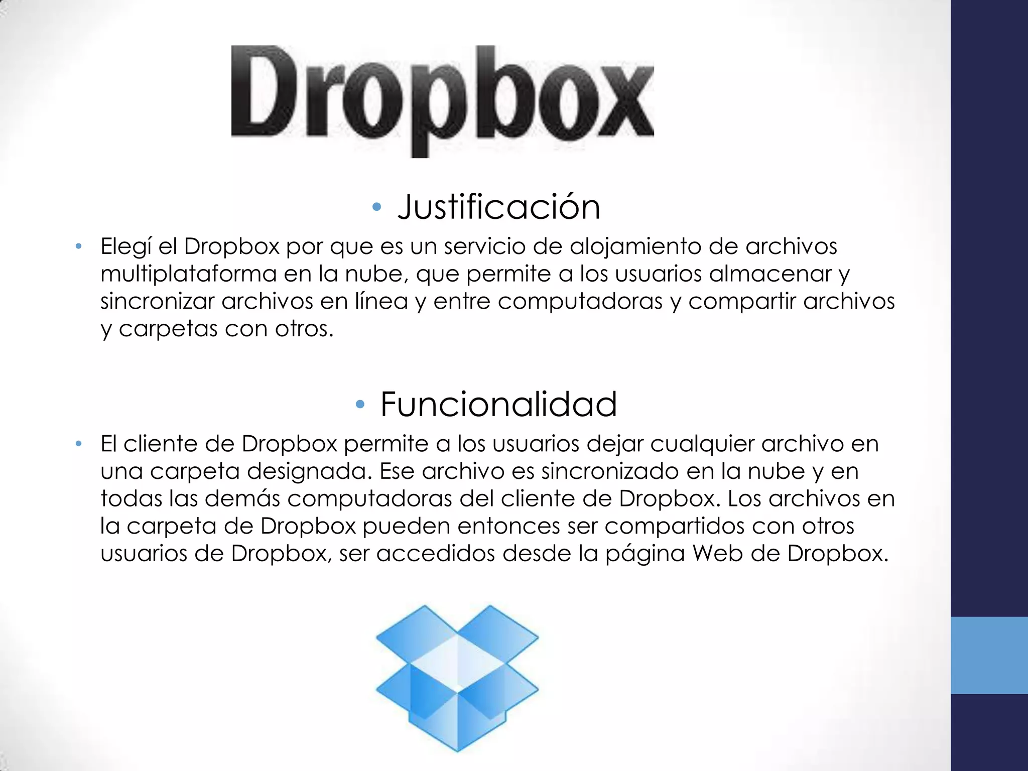 El documento describe las funciones y uso básico de Dropbox, un servicio de almacenamiento en la nube que permite sincronizar y compartir archivos entre dispositivos. Explica cómo crear una cuenta de Dropbox, instalar el cliente, seleccionar un plan de almacenamiento, y cargar archivos a la carpeta Dropbox para que se sincronicen y compartan en línea.