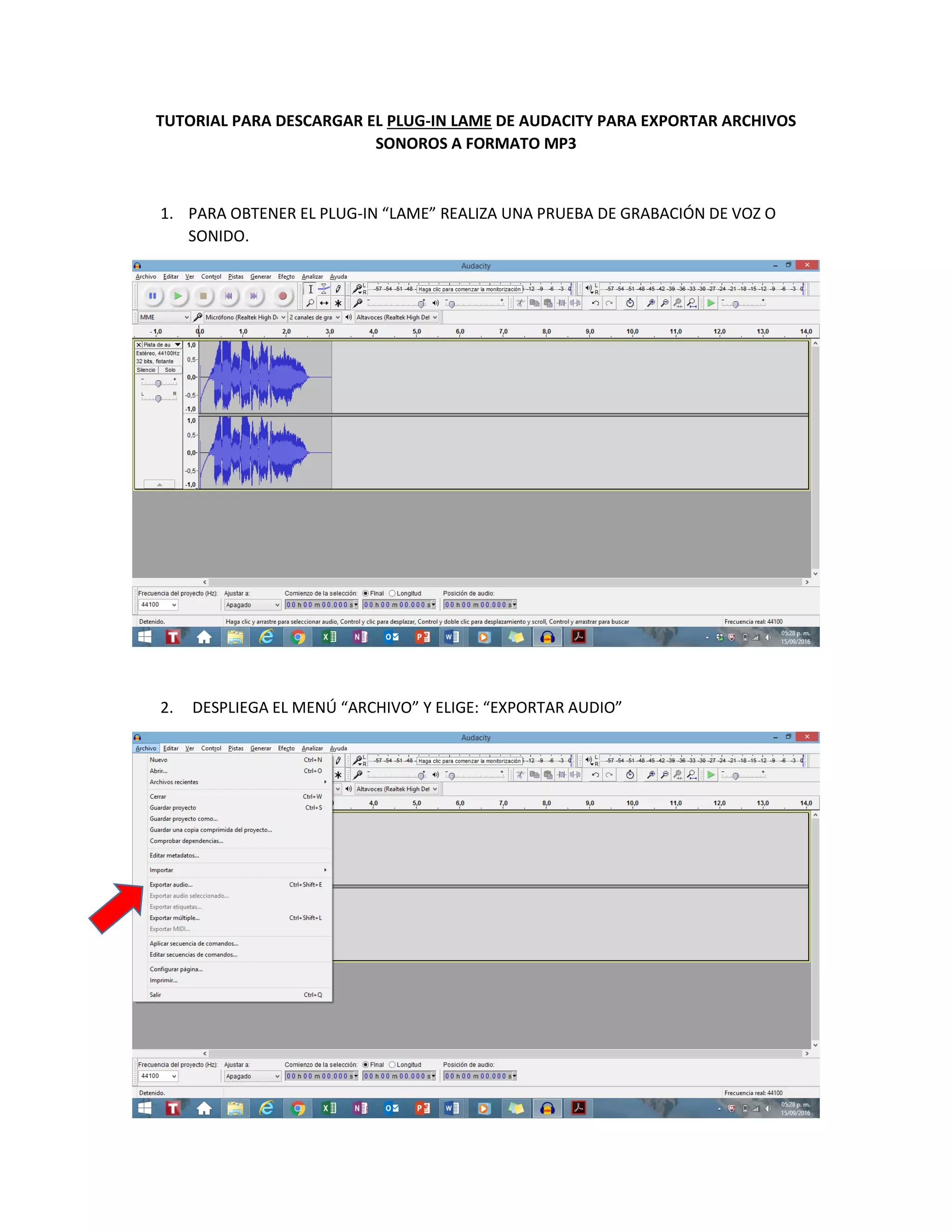 Este documento proporciona un tutorial en 12 pasos para descargar e instalar el complemento LAME en Audacity para exportar archivos de audio a formato MP3. Los pasos incluyen grabar una prueba de audio, seleccionar MP3 como formato de exportación, descargar e instalar LAME siguiendo las instrucciones proporcionadas y confirmar que la exportación a MP3 funciona correctamente.
