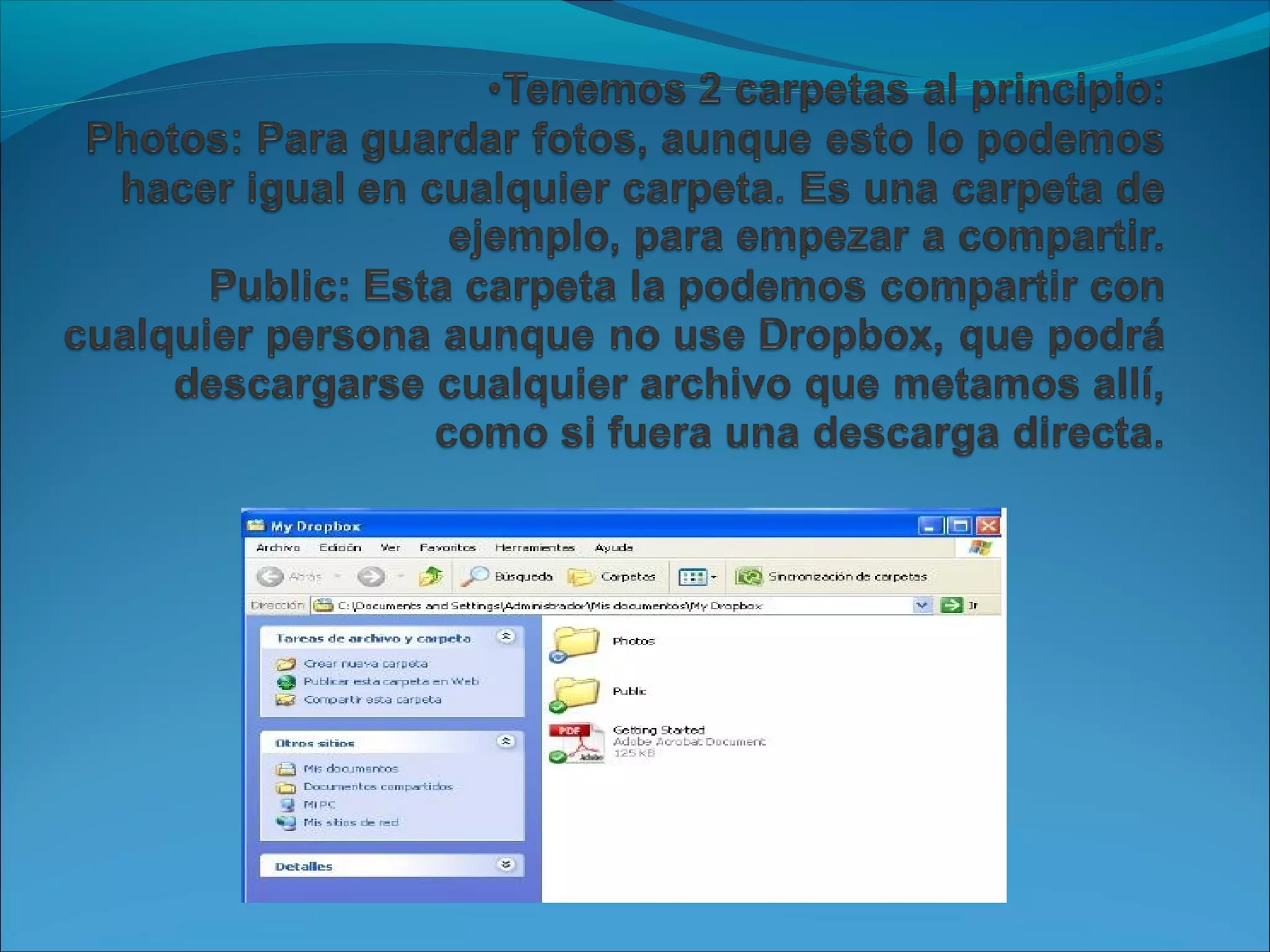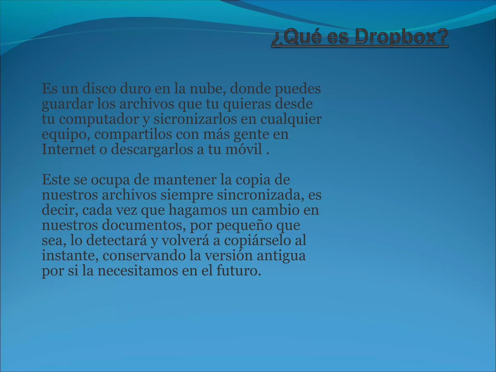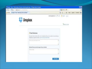 Dropbox es un servicio de almacenamiento en la nube que permite a los usuarios sincronizar y compartir archivos entre dispositivos. Los usuarios pueden almacenar archivos en una carpeta especial de Dropbox y acceder a esos archivos desde cualquier equipo u otro dispositivo, ya que se sincronizan automáticamente en la nube. Dropbox también permite a los usuarios compartir archivos de forma selectiva con otros a través de enlaces de invitación.