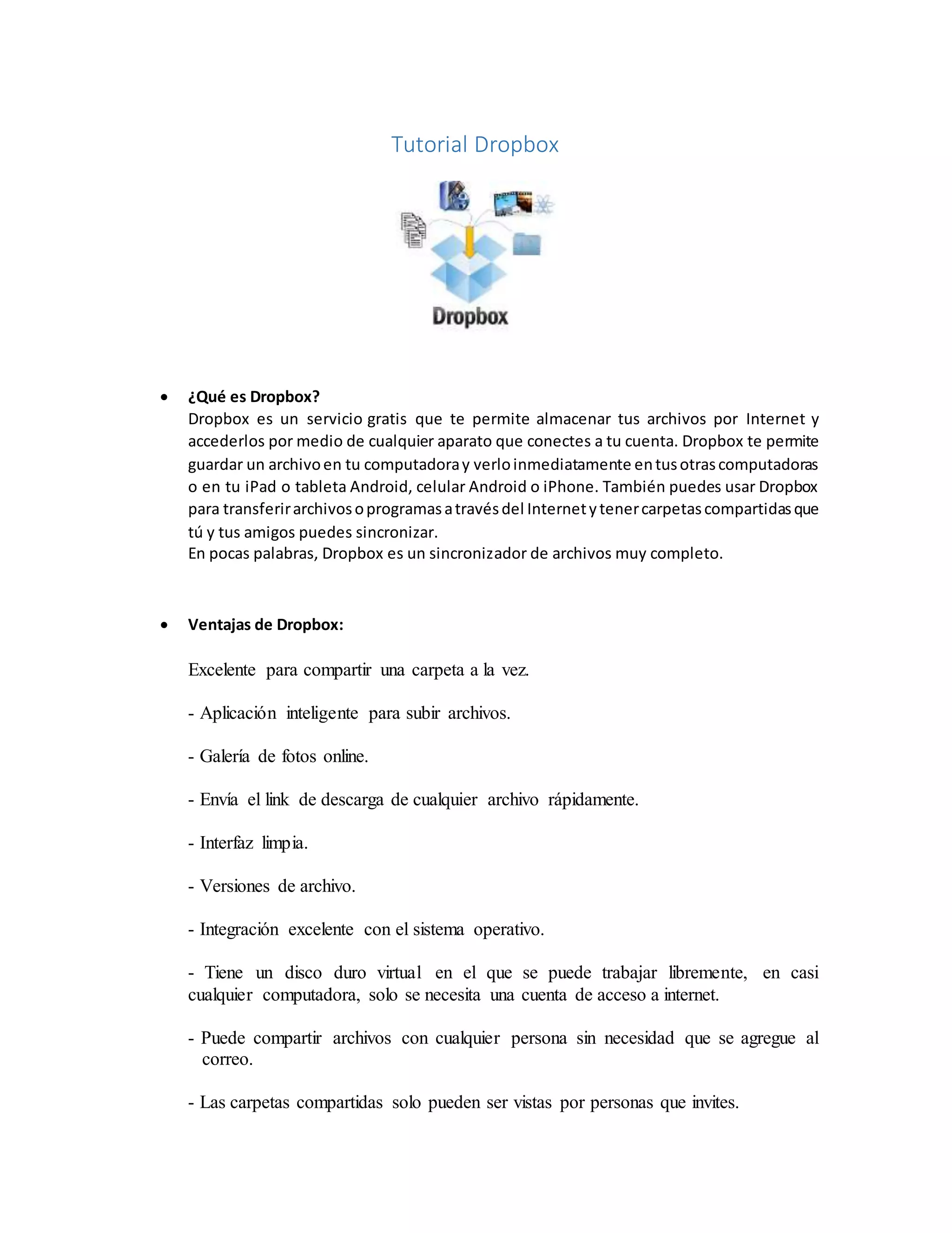 Dropbox es un servicio gratuito de almacenamiento en la nube que permite a los usuarios acceder y sincronizar archivos desde cualquier dispositivo. Los usuarios pueden crear carpetas compartidas para colaborar con otros. Dropbox requiere al menos 512 MB de RAM y espacio libre igual al espacio que se usará en Dropbox. Los usuarios pueden tener roles de solo lectura, editor o propietario de una carpeta compartida con diferentes niveles de permisos.