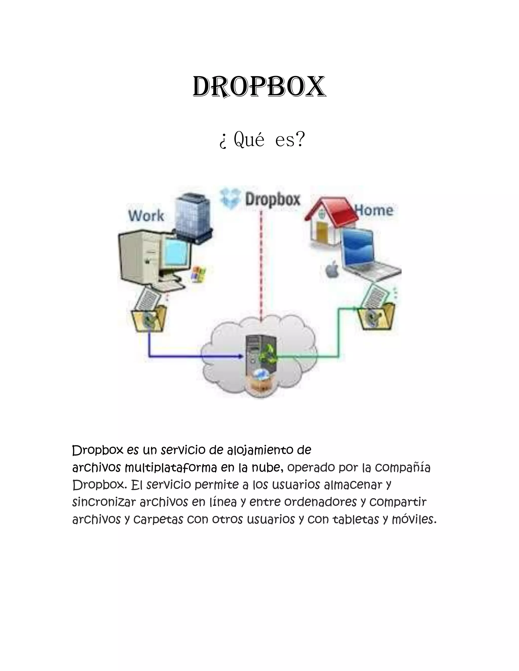Dropbox es un servicio de almacenamiento en la nube que permite a los usuarios sincronizar y compartir archivos entre dispositivos de forma segura. Ofrece ventajas como compartir archivos y carpetas fácilmente, subir archivos de forma inteligente, y funciona en varias plataformas siempre que se cumplan los requisitos técnicos mínimos como memoria RAM y espacio disponible equivalente a la cantidad de almacenamiento que se desea usar.