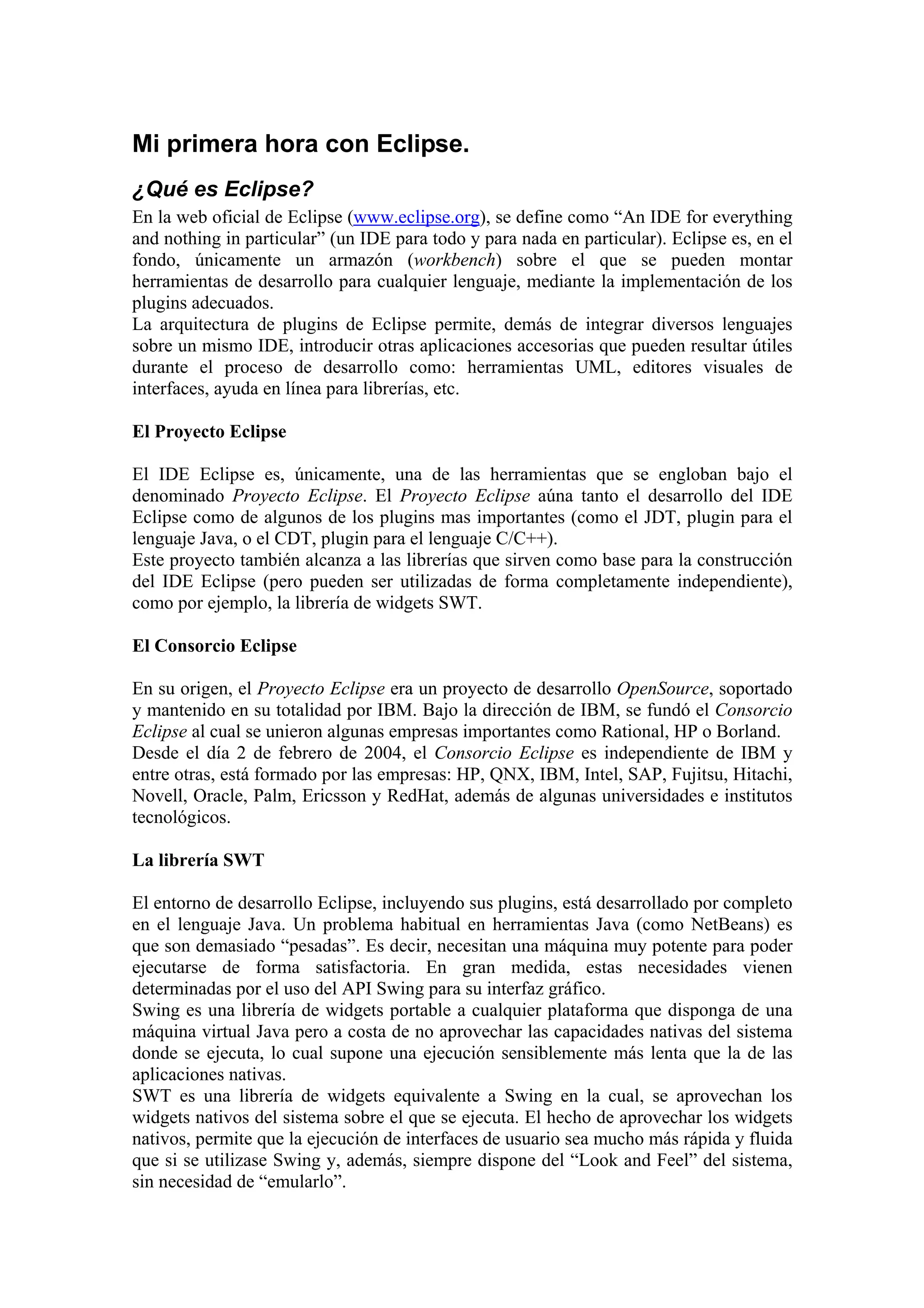 Mi primera horacon Eclipse. ¿Qué es Eclipse? En la web oficial de Eclipse (www.eclipse.org), se define como “An IDE for everything and nothing in particular” (un IDE para todo y para nada en particular). Eclipse es, en el fondo, únicamente un armazón (workbench) sobre el que se pueden montar herramientas de desarrollo para cualquier lenguaje, mediante la implementación de los plugins adecuados. La arquitectura de plugins de Eclipse permite, demás de integrar diversos lenguajes sobre un mismo IDE, introducir otras aplicaciones accesorias que pueden resultar útiles durante el proceso de desarrollo como: herramientas UML, editores visuales de interfaces, ayuda en línea para librerías, etc. El Proyecto Eclipse El IDE Eclipse es, únicamente, una de las herramientas que se engloban bajo el denominado Proyecto Eclipse. El Proyecto Eclipse aúna tanto el desarrollo del IDE Eclipse como de algunos de los plugins mas importantes (como el JDT, plugin para el lenguaje Java, o el CDT, plugin para el lenguaje C/C++). Este proyecto también alcanza a las librerías que sirven como base para la construcción del IDE Eclipse (pero pueden ser utilizadas de forma completamente independiente), como por ejemplo, la librería de widgets SWT. El Consorcio Eclipse En su origen, el Proyecto Eclipse era un proyecto de desarrollo OpenSource, soportado y mantenido en su totalidad por IBM. Bajo la dirección de IBM, se fundó el Consorcio Eclipse al cual se unieron algunas empresas importantes como Rational, HP o Borland. Desde el día 2 de febrero de 2004, el Consorcio Eclipse es independiente de IBM y entre otras, está formado por las empresas: HP, QNX, IBM, Intel, SAP, Fujitsu, Hitachi, Novell, Oracle, Palm, Ericsson y RedHat, además de algunas universidades e institutos tecnológicos. La librería SWT El entorno de desarrollo Eclipse, incluyendo sus plugins, está desarrollado por completo en el lenguaje Java. Un problema habitual en herramientas Java (como NetBeans) es que son demasiado “pesadas”. Es decir, necesitan una máquina muy potente para poder ejecutarse de forma satisfactoria. En gran medida, estas necesidades vienen determinadas por el uso del API Swing para su interfaz gráfico. Swing es una librería de widgets portable a cualquier plataforma que disponga de una máquina virtual Java pero a costa de no aprovechar las capacidades nativas del sistema donde se ejecuta, lo cual supone una ejecución sensiblemente más lenta que la de las aplicaciones nativas. SWT es una librería de widgets equivalente a Swing en la cual, se aprovechan los widgets nativos del sistema sobre el que se ejecuta. El hecho de aprovechar los widgets nativos, permite que la ejecución de interfaces de usuario sea mucho más rápida y fluida que si se utilizase Swing y, además, siempre dispone del “Look and Feel” del sistema, sin necesidad de “emularlo”.
