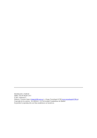 Este documento proporciona una introducción a Android, incluyendo una breve historia, las capas del sistema operativo, versiones disponibles y cómo configurar Eclipse como entorno de desarrollo. Explica que Android es un sistema operativo móvil de código abierto basado en Linux, desarrollado principalmente por Google.