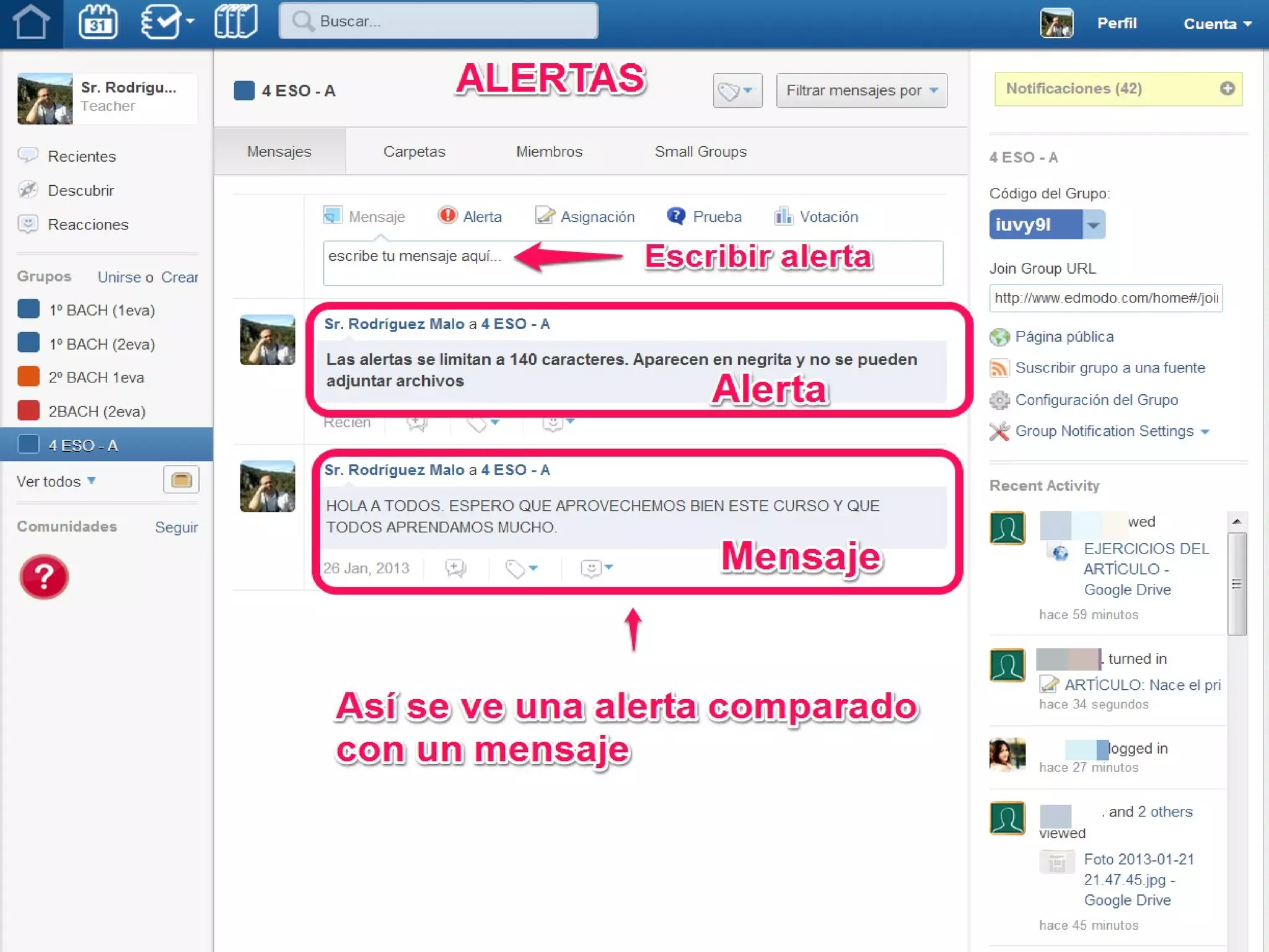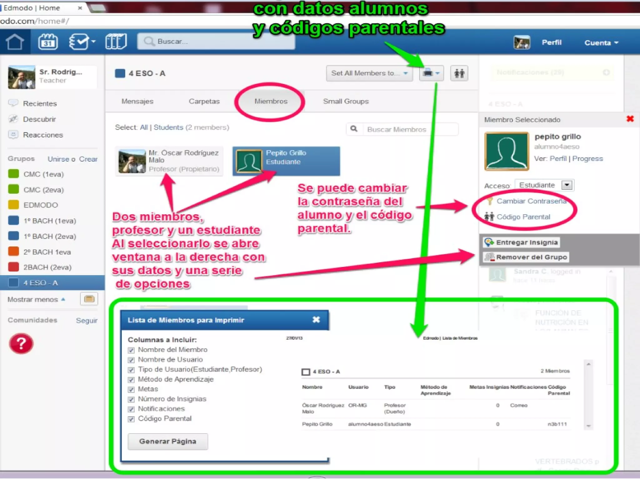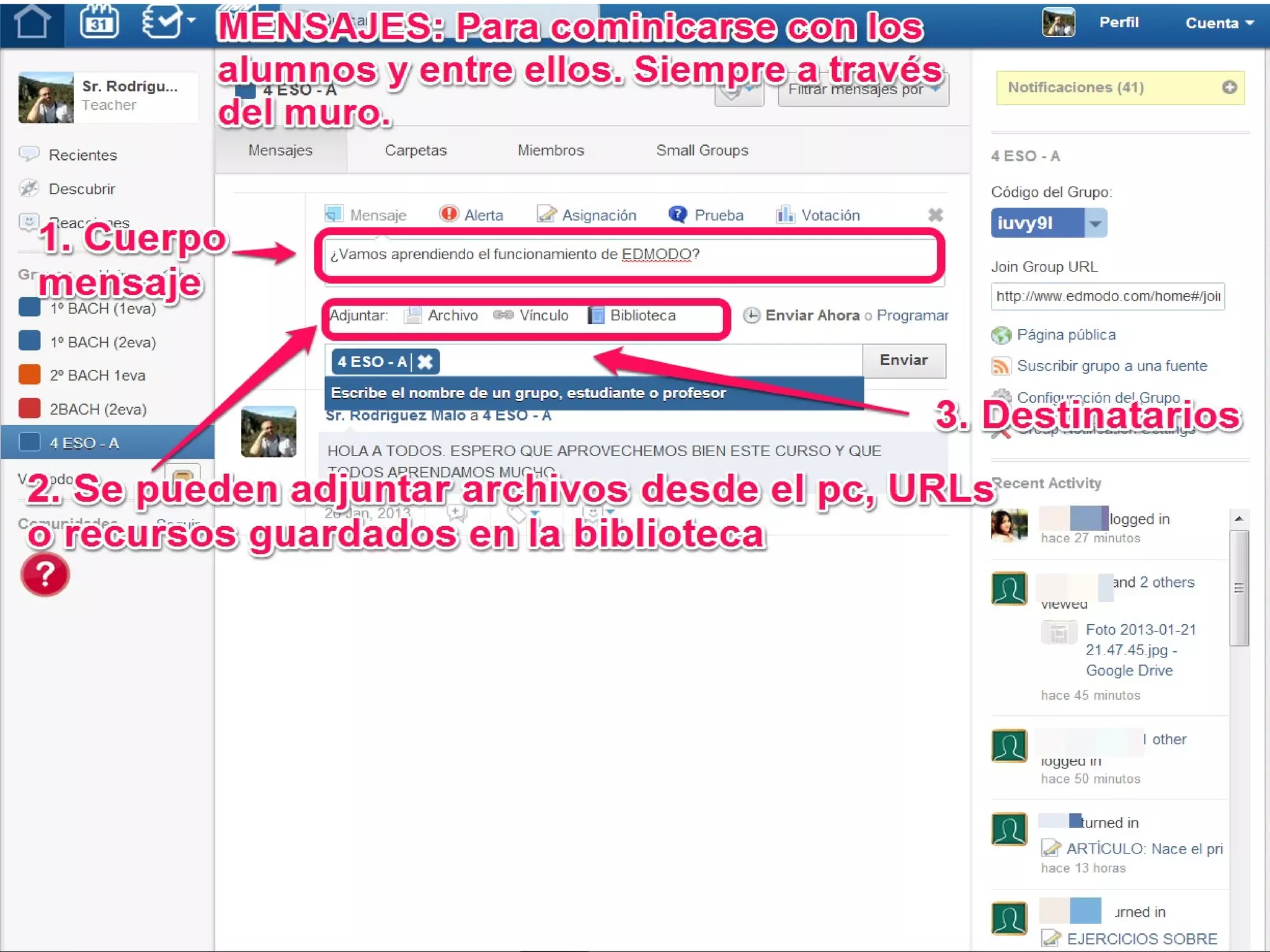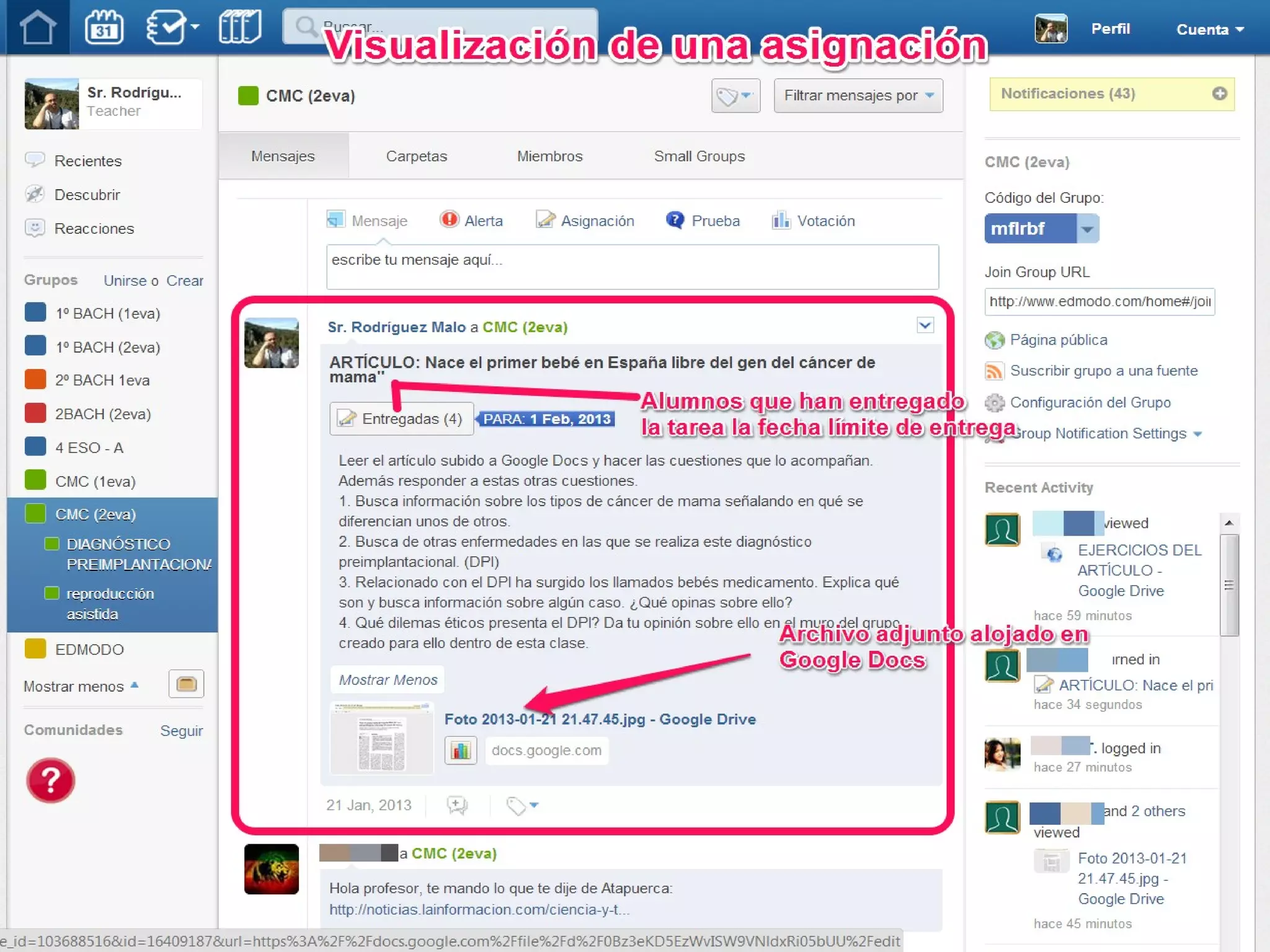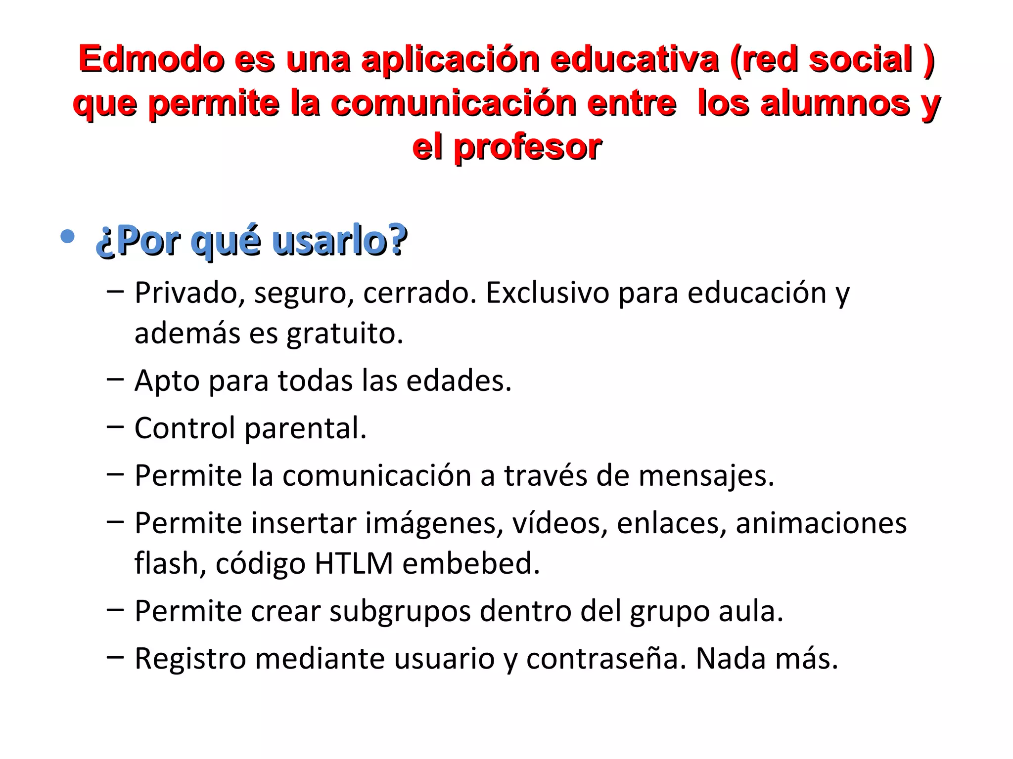 Edmodo es una aplicación educativa gratuita que permite la comunicación segura entre profesores y alumnos a través de mensajes, tareas y exámenes. Los profesores pueden crear grupos, enviar recursos, realizar un seguimiento del progreso de los estudiantes y comunicarse con padres a través de códigos. La aplicación también proporciona una biblioteca para almacenar y compartir recursos educativos.