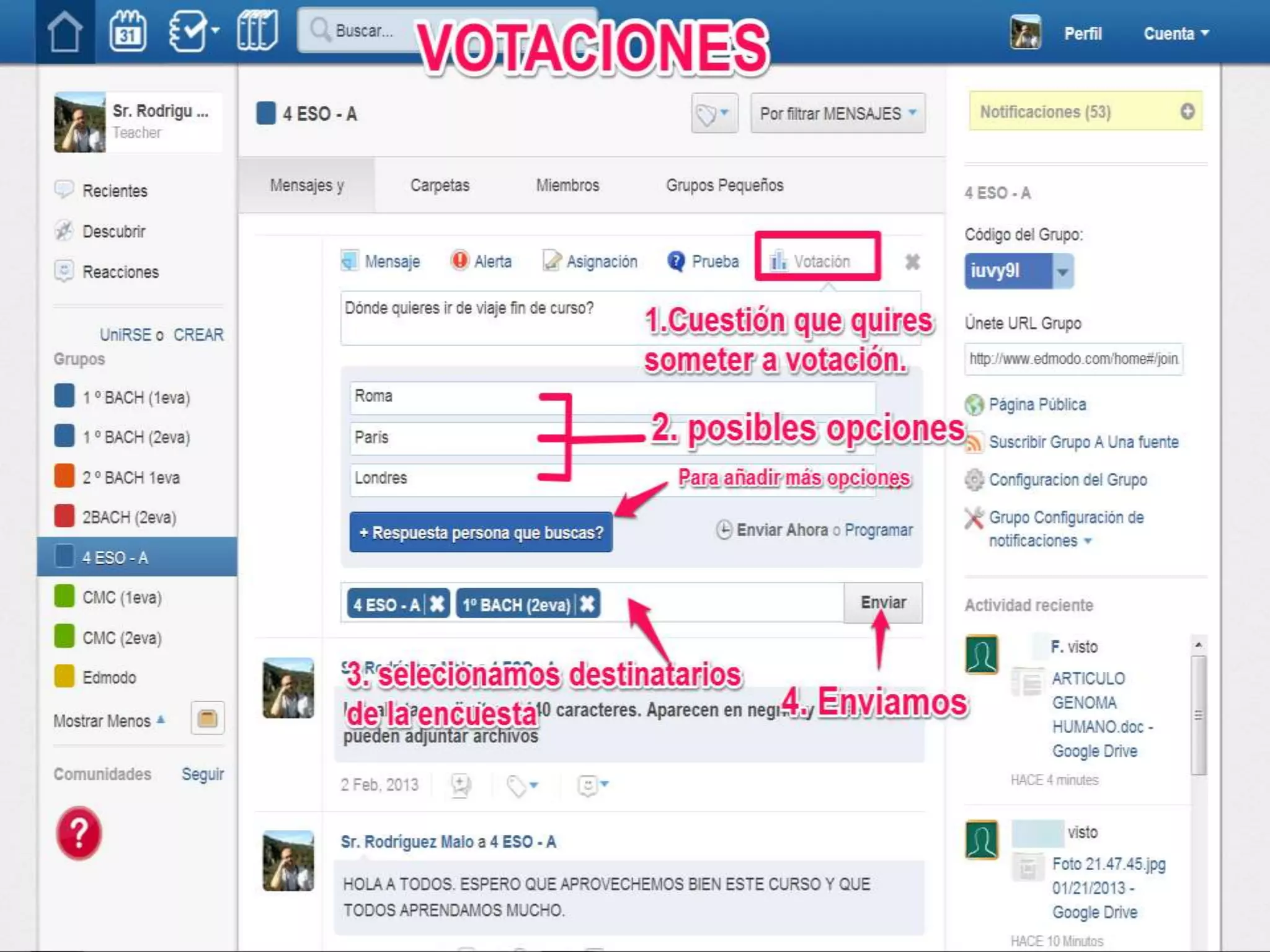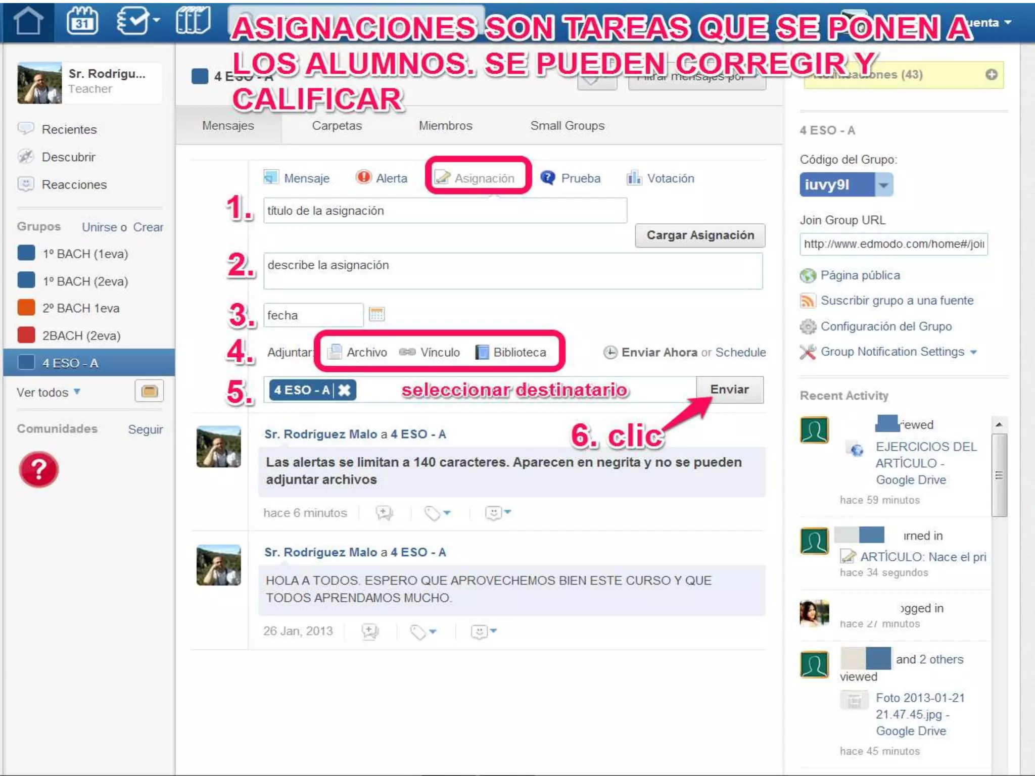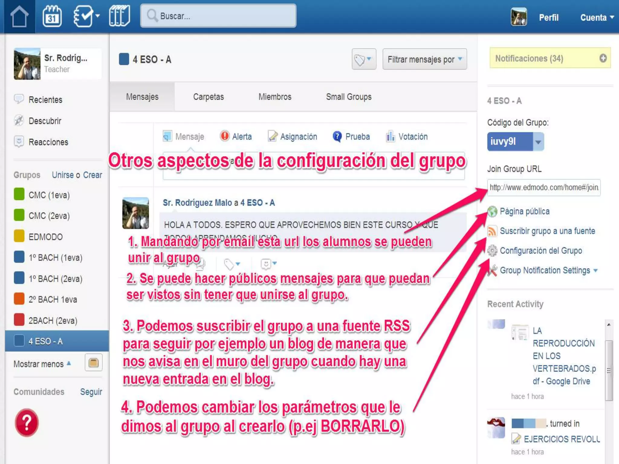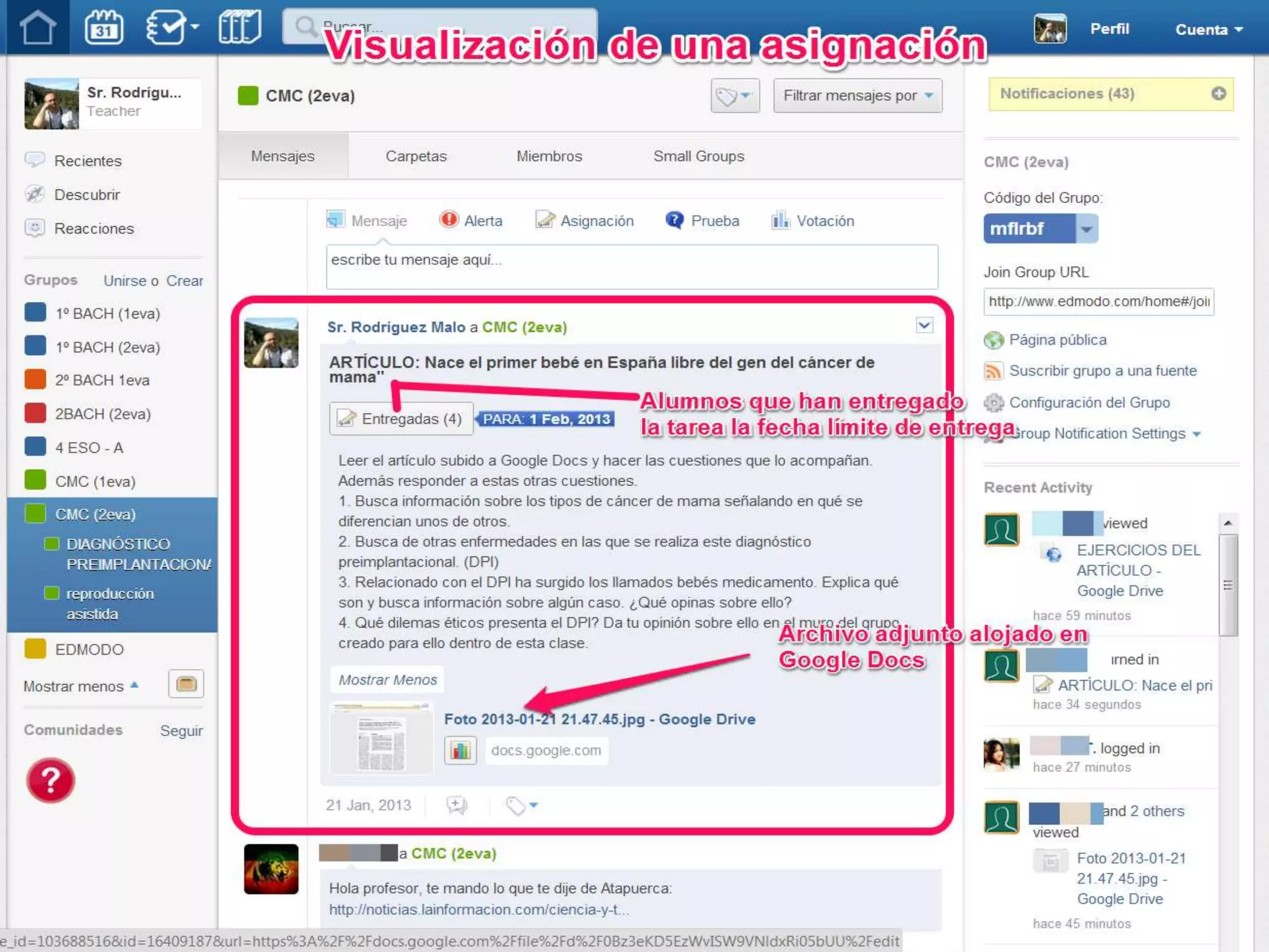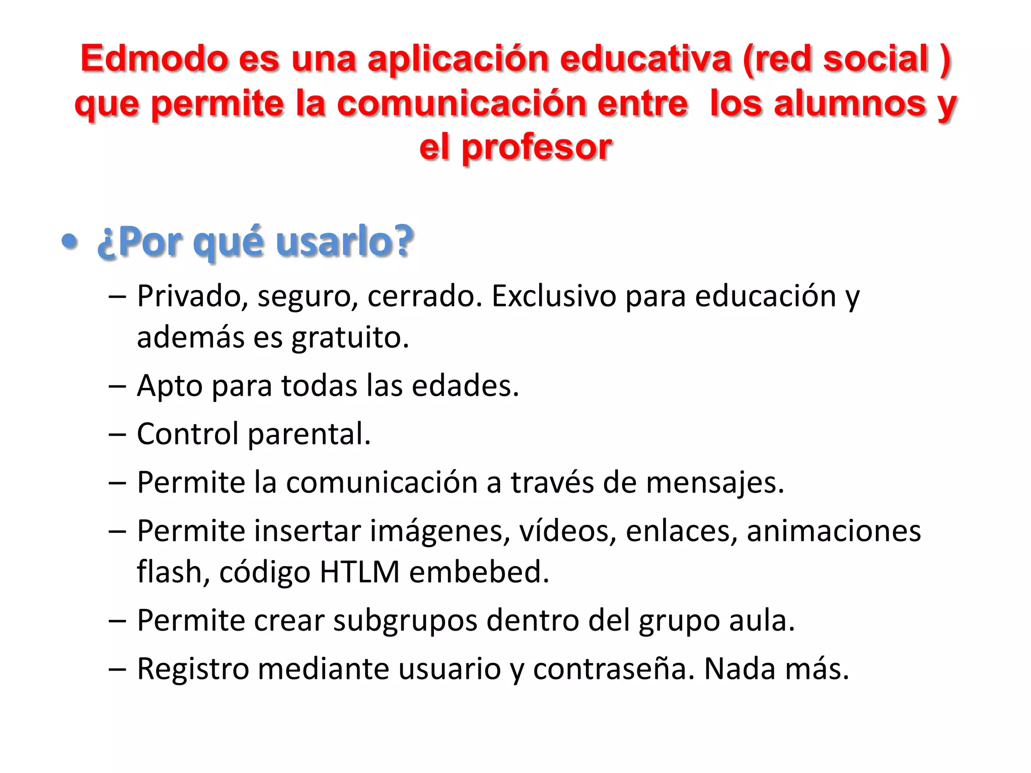 Edmodo es una aplicación educativa gratuita que permite la comunicación segura entre profesores y alumnos a través de mensajes, tareas y exámenes. Los profesores pueden crear grupos, enviar recursos como archivos, enlaces y videos, y realizar un seguimiento del progreso de los estudiantes. Edmodo ofrece funciones como un calendario, biblioteca de recursos y control parental.