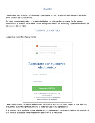 Edmodo es una red social educativa que facilita la comunicación entre maestros, alumnos y padres, permitiendo el seguimiento del progreso estudiantil. La plataforma se integra con cuentas de Microsoft, lo que potencia su funcionalidad, y el proceso de registro y configuración es sencillo. Además, Edmodo ofrece una alternativa a las redes sociales convencionales, promoviendo un entorno de aprendizaje colaborativo.