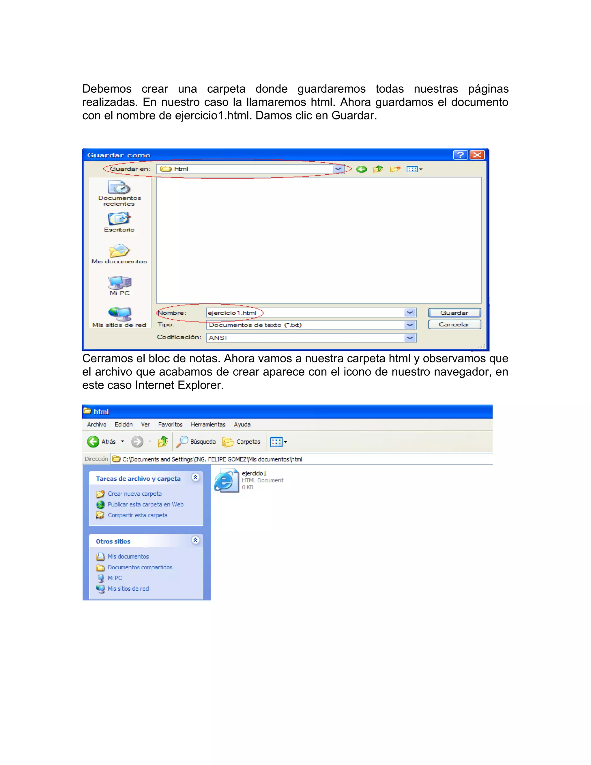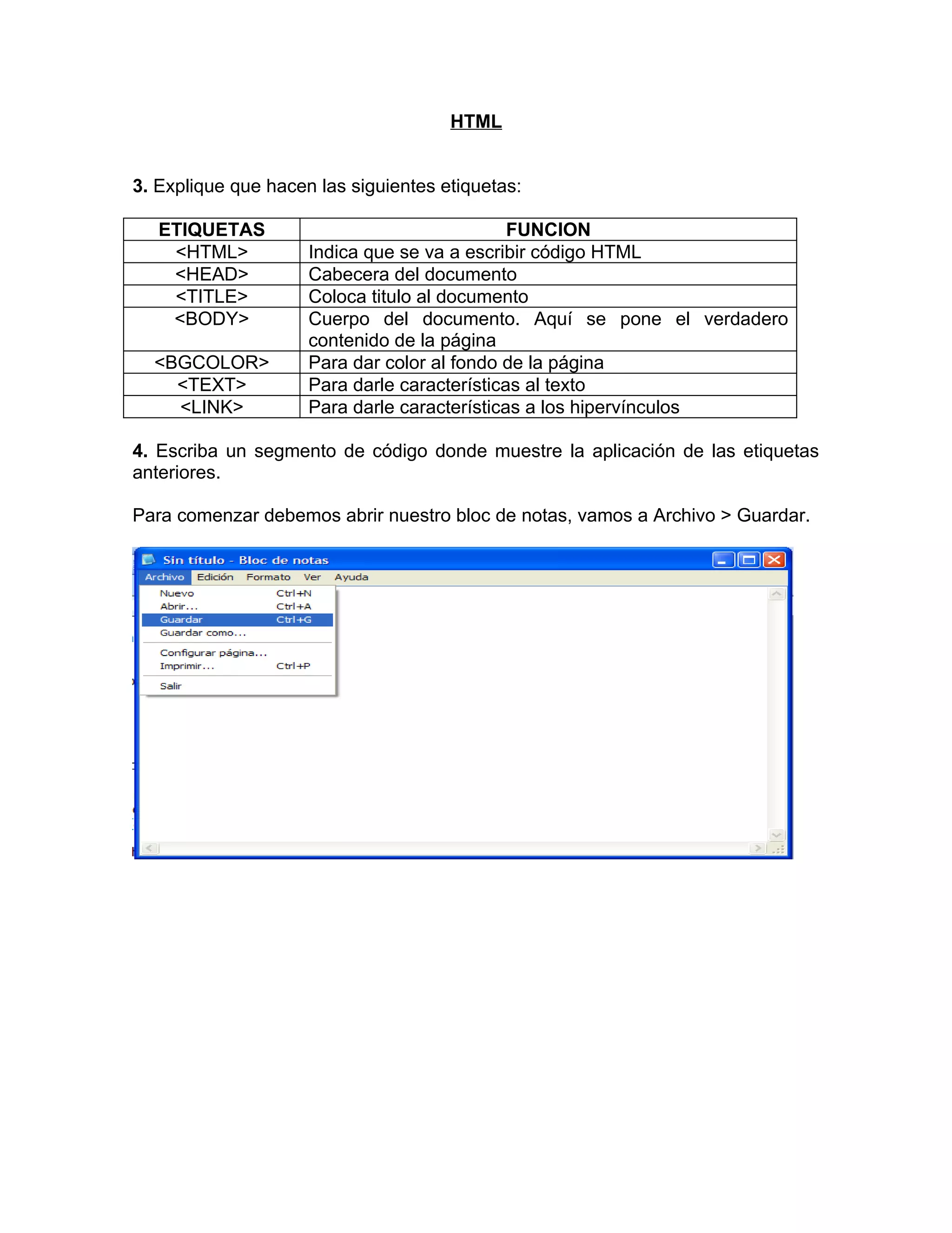El documento explica que HTML es el lenguaje de marcado utilizado para crear páginas web y describe algunas de sus etiquetas básicas como <HTML>, <HEAD>, <TITLE>, <BODY>, <BGCOLOR>, <TEXT> y <LINK>. También incluye un ejemplo de código HTML que utiliza estas etiquetas para dar formato a un texto y añadir un hipervínculo.
