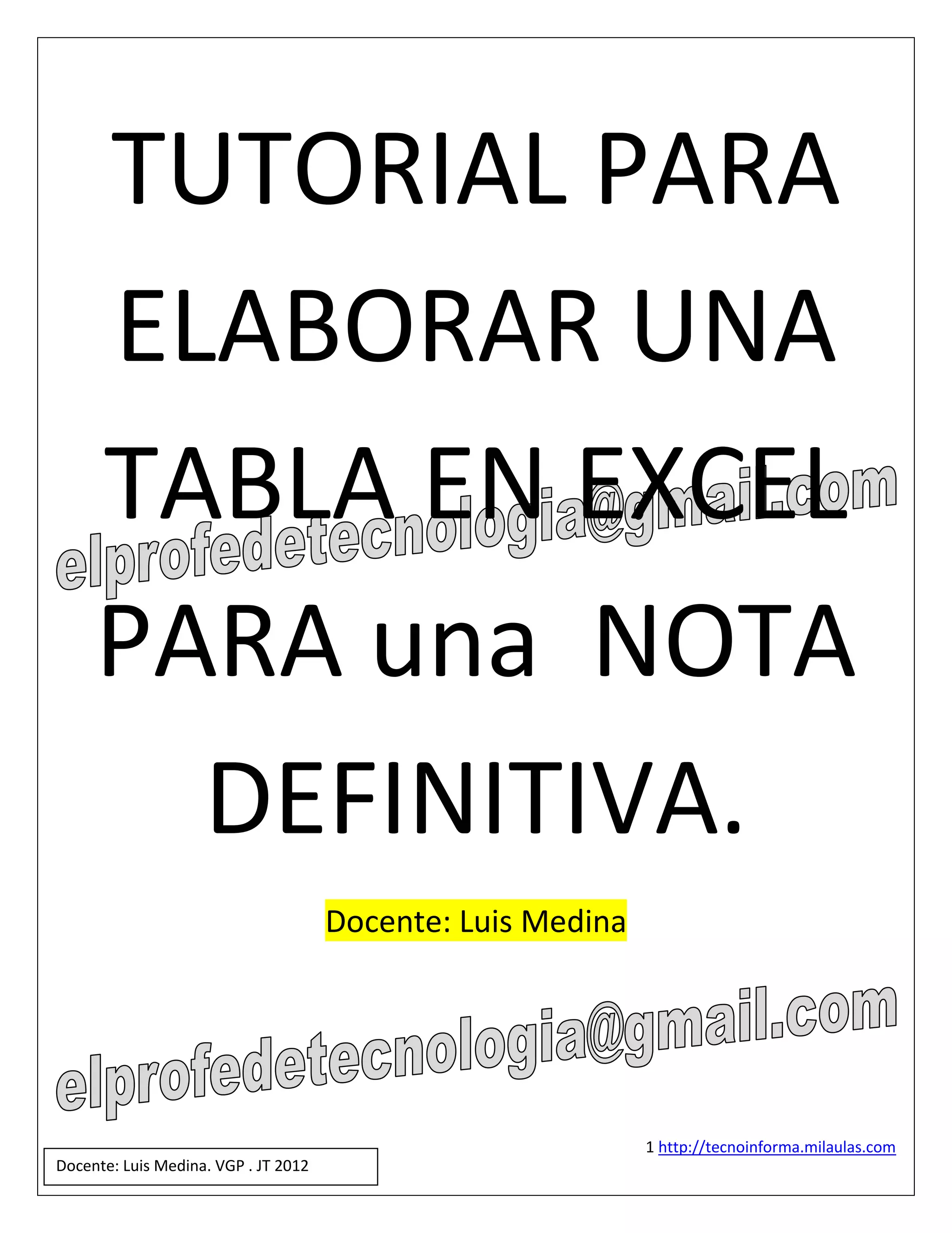 El documento proporciona instrucciones paso a paso para crear una tabla en Excel para calcular la nota definitiva de un estudiante. Incluye cómo combinar celdas, ajustar texto, agregar bordes, y usar una fórmula para calcular la nota final basada en las notas y porcentajes asignados a diferentes actividades. El estudiante debe enviar por correo electrónico el archivo de Excel con su nota final.