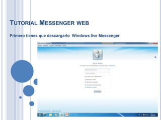 Este documento ofrece instrucciones para usar Windows Live Messenger, incluyendo cómo iniciar sesión con correo electrónico y contraseña, agregar y editar contactos, crear grupos arrastrando contactos a Favoritos, cambiar tu estado y nombre de usuario, mostrar la música que estás escuchando, abrir la bandeja de entrada, cambiar el papel tapiz, ver el perfil de otros usuarios, y cerrar sesión.