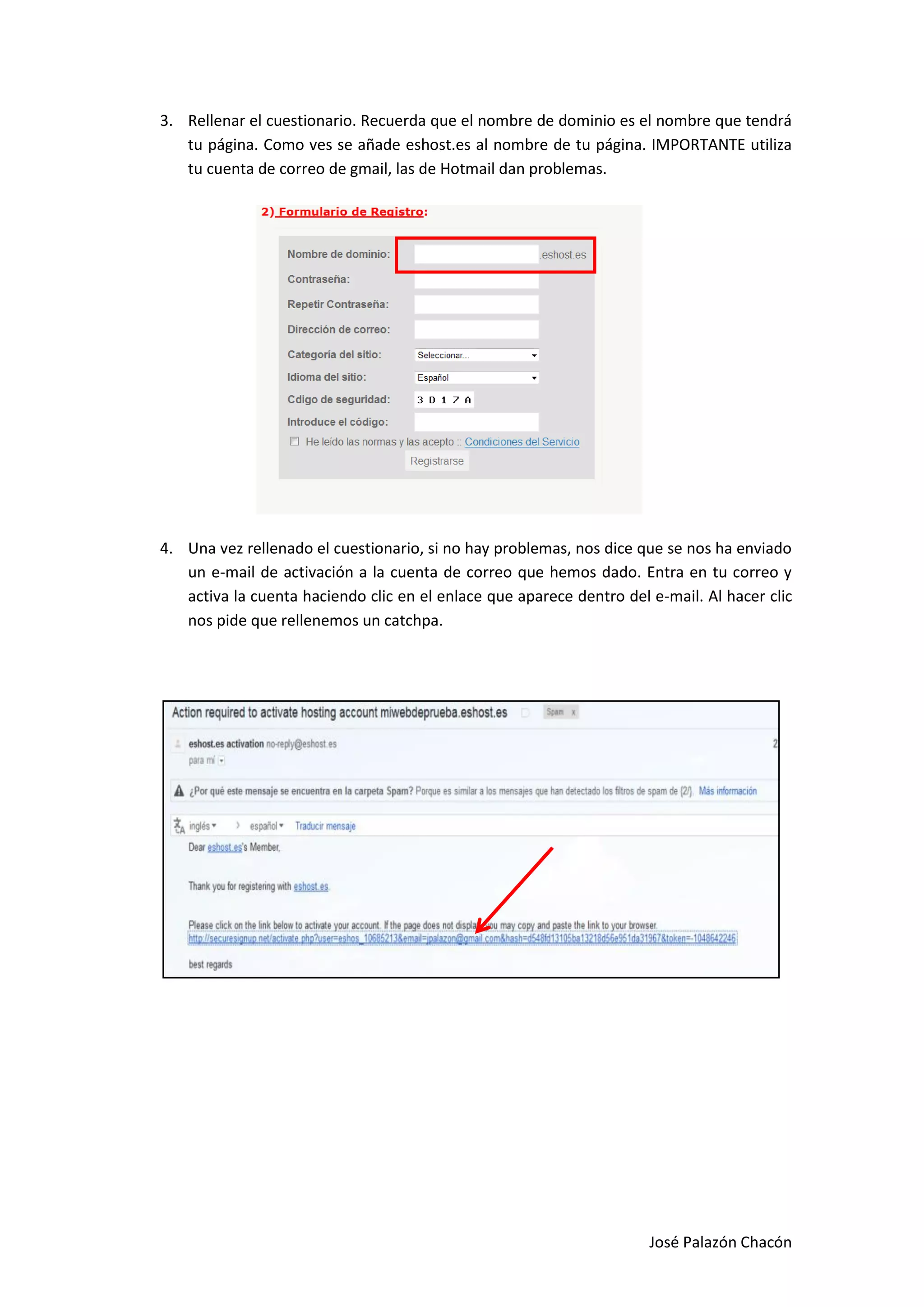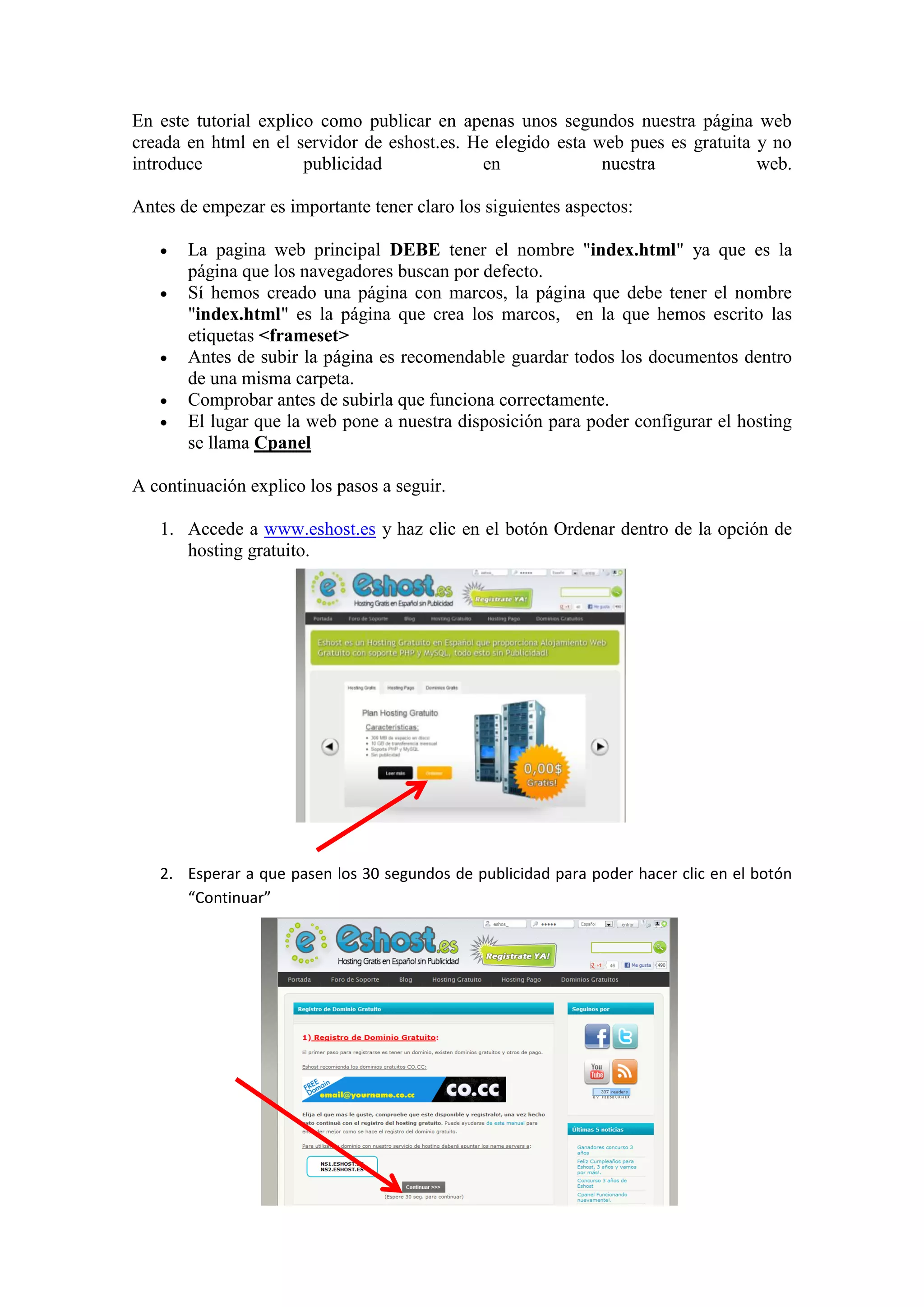 Este documento explica los 11 pasos para publicar una página web creada en HTML en el servidor gratuito eshost.es. Estos pasos incluyen crear una cuenta en eshost.es, verificar la cuenta a través de correo electrónico, acceder al panel de control Cpanel, subir los archivos HTML y recursos relacionados a la carpeta htdocs, y asegurarse que el archivo index.html esté disponible directamente para que los visitantes puedan acceder a la página web publicada.