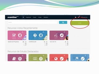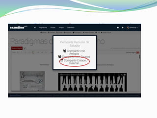 El documento describe el uso de la plataforma Examtime para crear trabajos individuales y colaborativos. Se menciona la capacidad de agregar títulos, videos, imágenes y texto, y cómo se organiza dinámicamente el contenido. También se indica la función de compartir un enlace URL para su inclusión en informes.