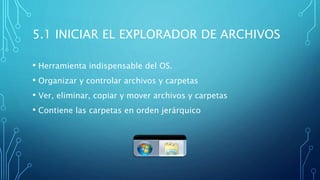 Este documento describe las funciones principales del Explorador de Archivos en Windows. Explica cómo usar el Explorador para organizar, buscar y administrar archivos y carpetas. También cubre temas como copiar, mover y eliminar archivos, crear y renombrar carpetas, cambiar las vistas y ordenar los elementos. Además, introduce conceptos como la Papelera de Reciclaje, OneDrive y las Propiedades de archivos y carpetas.