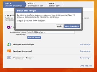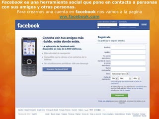 Este documento proporciona un tutorial sobre cómo crear una cuenta de Facebook en 3 pasos: 1) ir a www.facebook.com y completar los campos de registro; 2) buscar amigos automáticamente o omitir este paso; 3) completar la información de perfil, subir una foto o tomar una con la cámara web, y verificar la cuenta a través del correo electrónico.