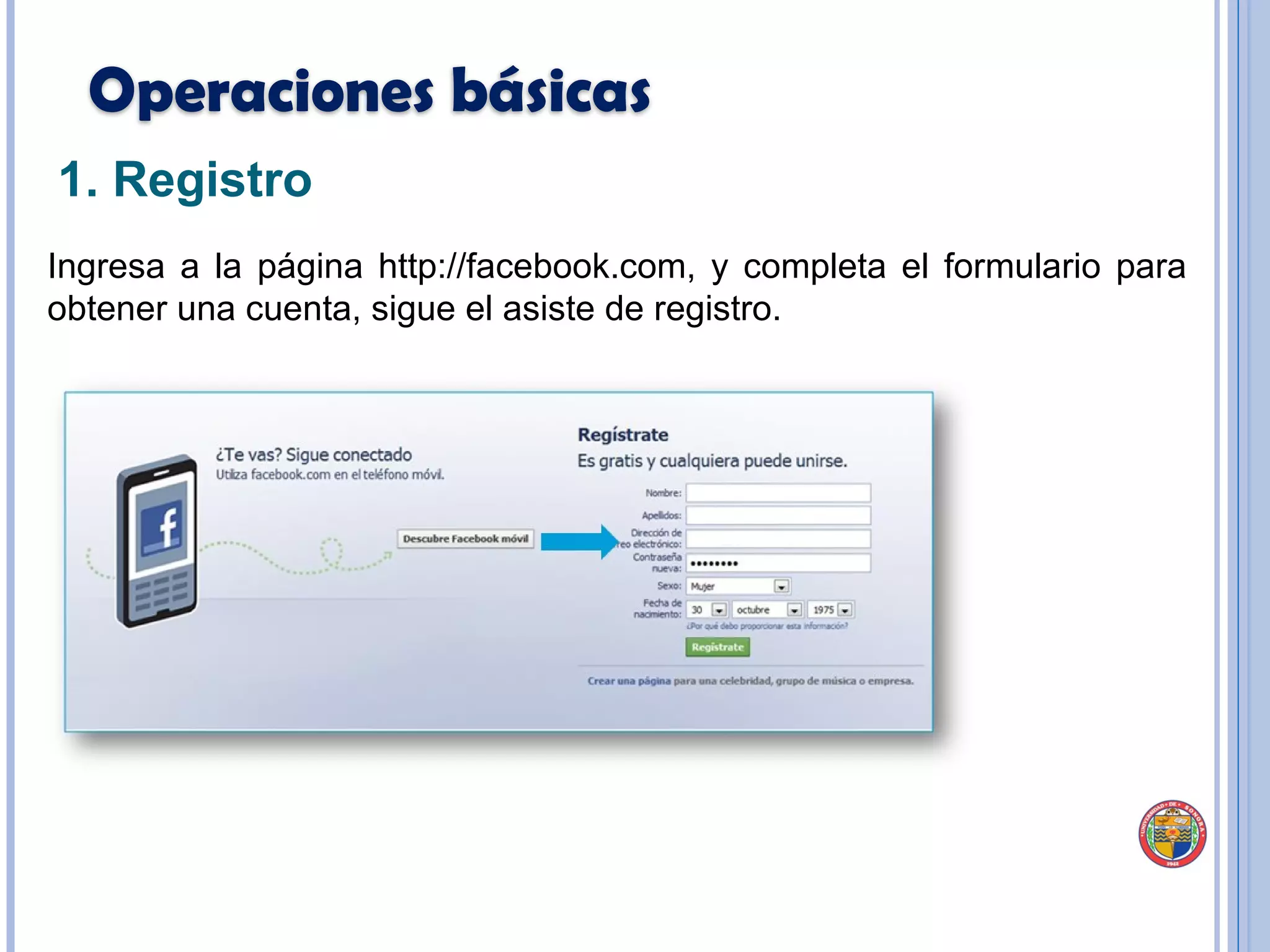 Este documento presenta un tutorial sobre cómo registrarse y utilizar las funciones básicas de Facebook. Explica los pasos para crear una cuenta, agregar amigos, editar el perfil personal con foto e información, y crear grupos para conversar con otros usuarios. Resalta opciones como buscar amigos por escuela, universidad o empresa, y personalizar la privacidad y contenido de los grupos después de llenar la información básica.