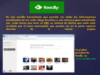 Feedly es una herramienta que permite agregar sitios web y blogs favoritos a una sola página para ver las actualizaciones de contenido de manera consolidada. Los usuarios deben crear una cuenta de Gmail y luego iniciar sesión en feedly.com, donde pueden agregar temas de interés como tecnología, moda y gastronomía. Al hacer clic en un tema, se despliegan diferentes secciones para agregar esos feeds a la biblioteca personal del usuario en feedly.