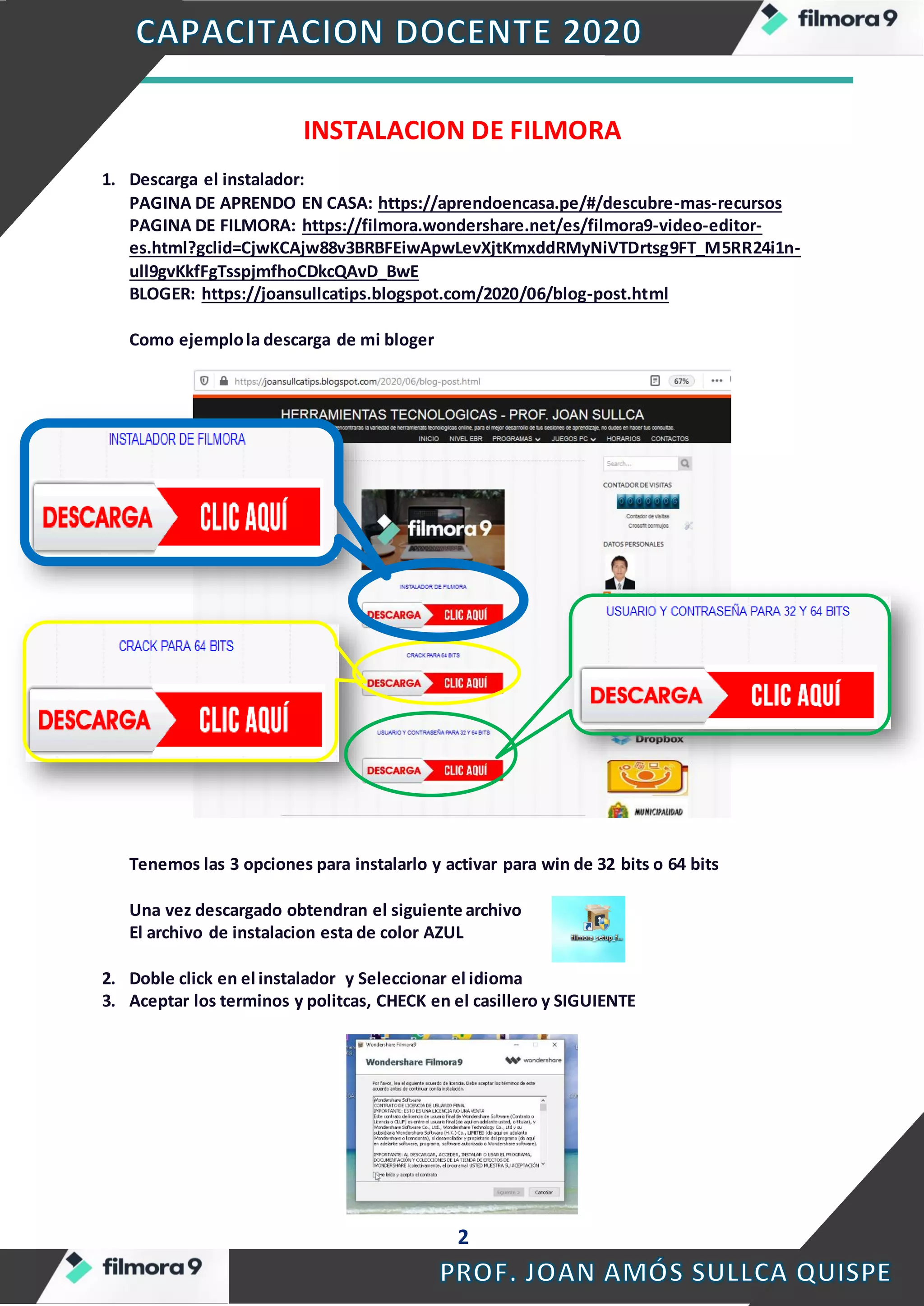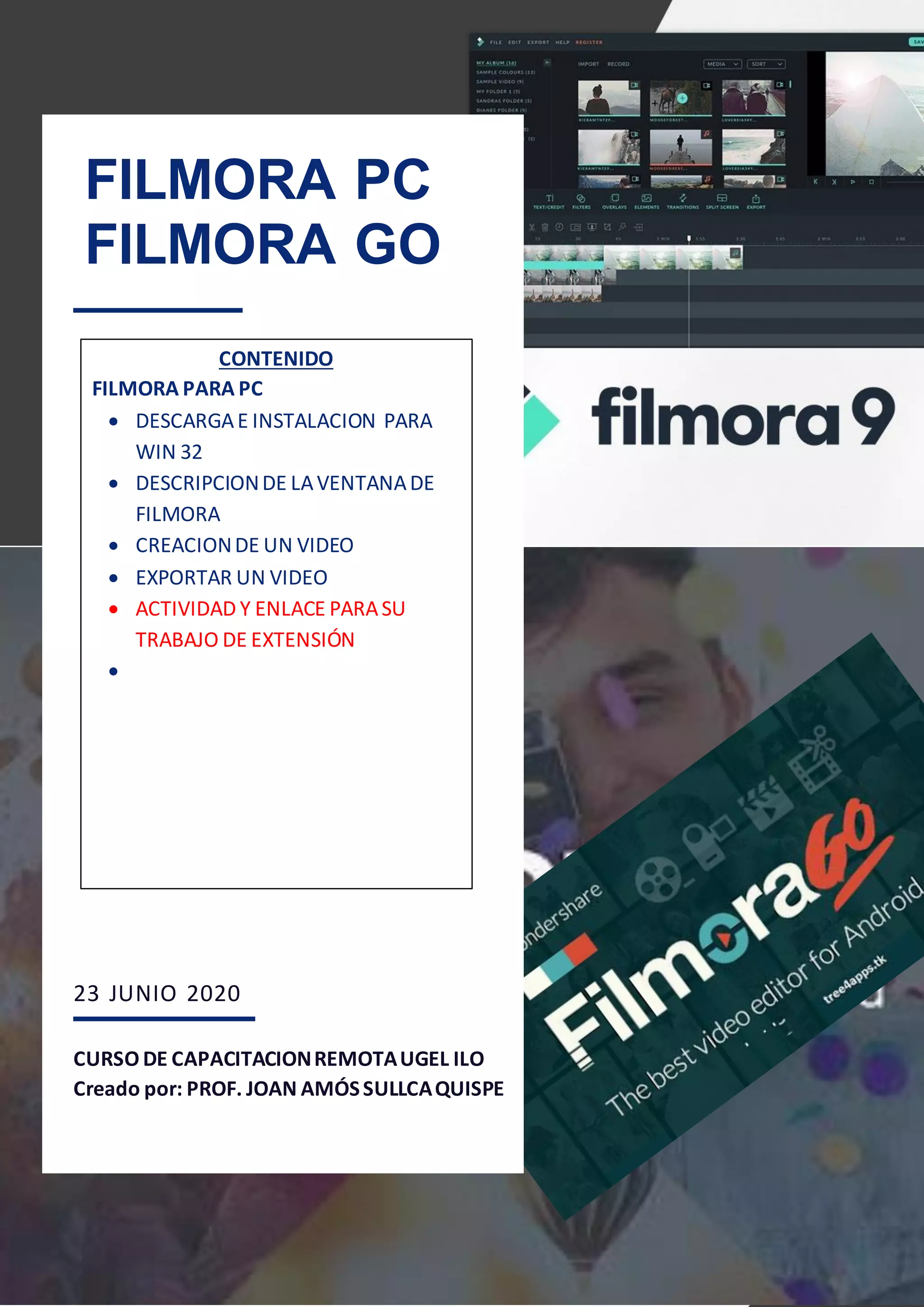 Este documento proporciona instrucciones para instalar y utilizar el software de edición de video Filmora en PC. Explica cómo descargar e instalar Filmora, activar la versión de prueba ilimitada, y crear un video de presentación simple integrando imágenes, videos, audio y texto con transiciones. Al final, insta a los lectores a crear su propio video tutorial sobre su especialidad usando las funciones de Filmora y compartirlo en un enlace de Google Drive.
