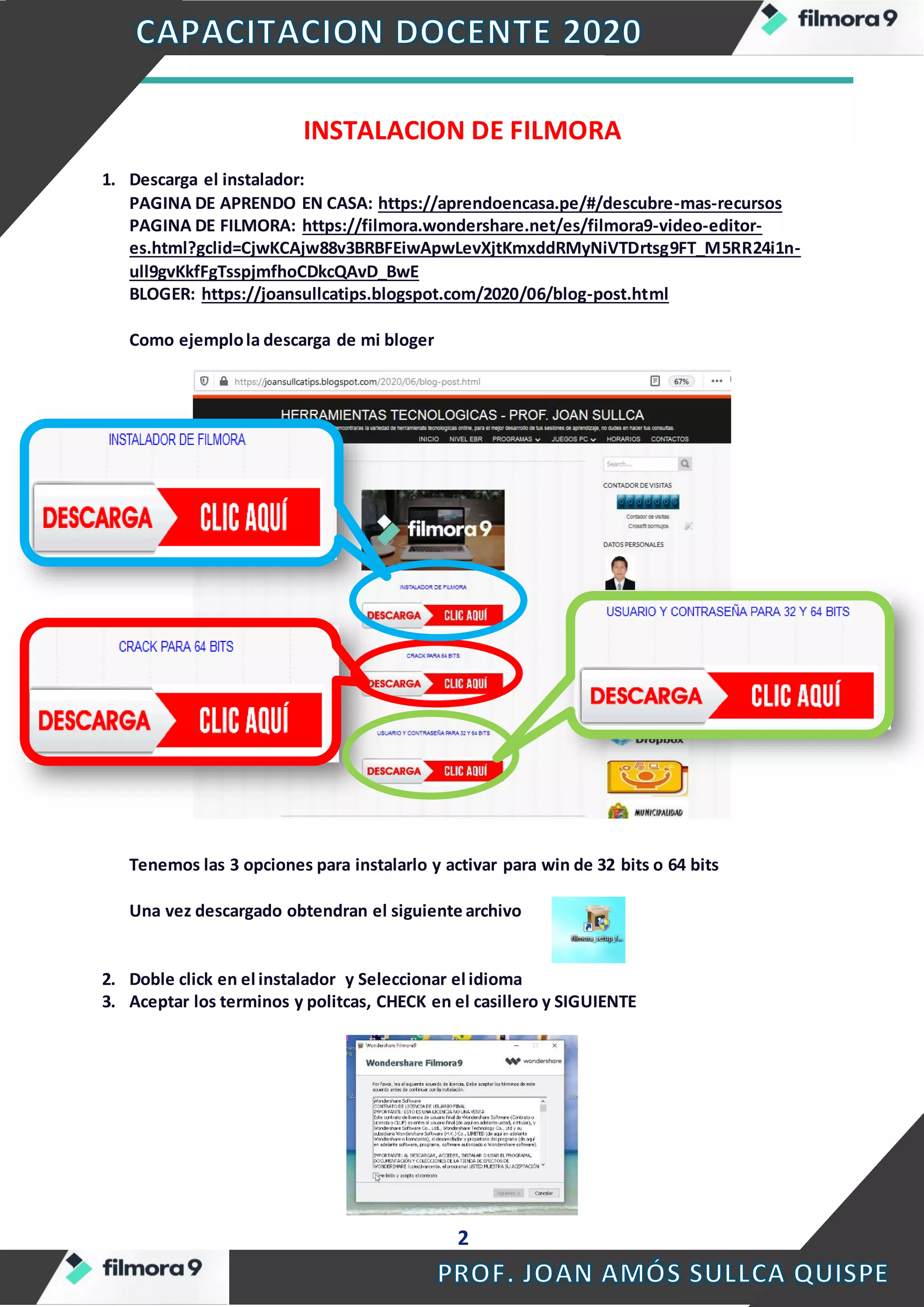 Este documento proporciona instrucciones detalladas para descargar, instalar y utilizar el software de edición de video Filmora en una PC. Explica cómo descargar e instalar Filmora, crackear la versión de 64 bits, crear un video con imágenes, texto, audio y transiciones, y exportar el video finalizado. Finalmente, solicita a los lectores que creen su propio video educativo siguiendo las especificaciones proporcionadas y lo envíen a un enlace de Google Drive compartido.