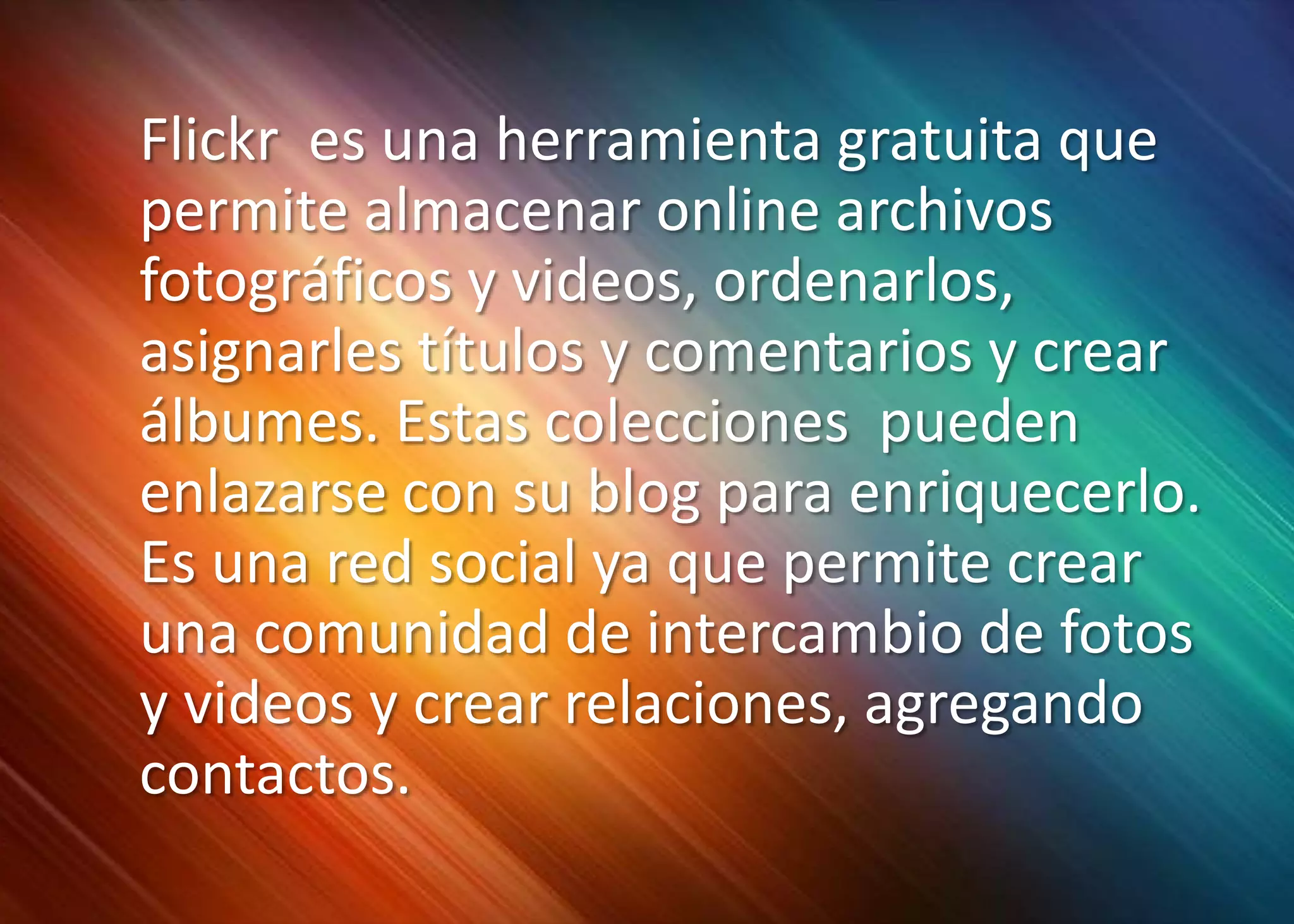 Flickr es una herramienta gratuita para almacenar, organizar y compartir fotos y videos en línea. Los usuarios pueden crear cuentas, subir colecciones de imágenes, agregar títulos y comentarios, y vincular álbumes a sus blogs. Flickr también permite crear una comunidad al agregar contactos y compartir contenido.