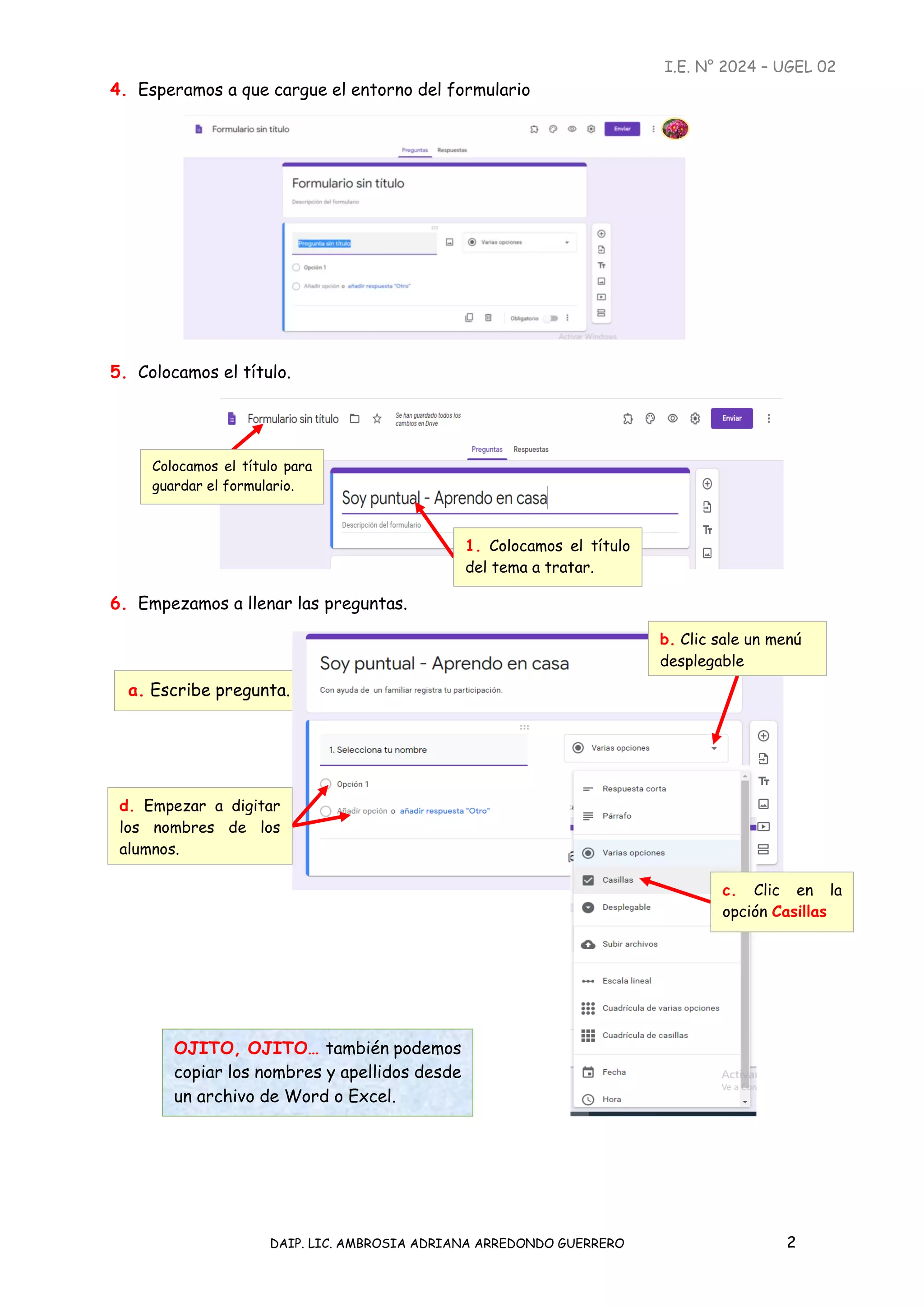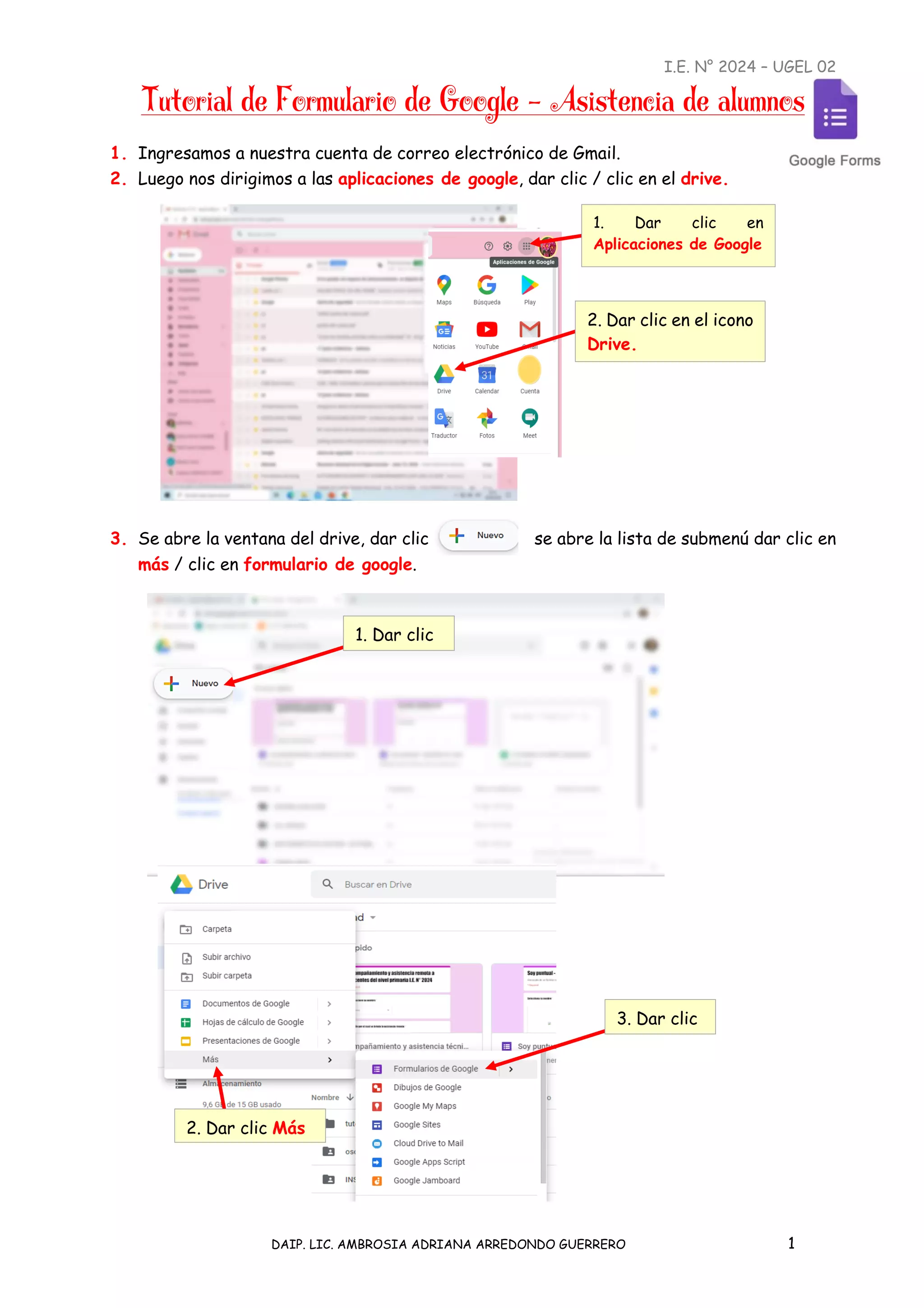 El documento proporciona instrucciones sobre cómo crear un formulario de asistencia de estudiantes en Google Forms. Explica los pasos para ingresar a la cuenta de Gmail, abrir Google Drive, crear un nuevo formulario, agregar preguntas y opciones de respuesta, incluir fotos de estudiantes, compartir el formulario y descargar las respuestas en un archivo de Excel.