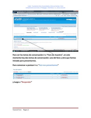 El documento proporciona instrucciones sobre cómo usar un foro en línea. Explica cómo iniciar sesión en el foro, navegar entre los temas existentes, responder a un tema existente, y crear un nuevo tema en el foro.