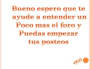 El documento proporciona instrucciones paso a paso para participar en un foro de discusión en la página web Alacan. Explica cómo navegar a la sección de foros, seleccionar una categoría y tema de interés, leer las respuestas anteriores, escribir un nuevo comentario usando el editor de texto provisto, y enviar la respuesta al foro.