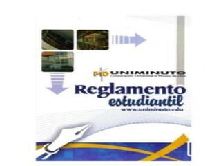 El documento detalla la misión y visión de Uniminuto, así como el reglamento estudiantil que establece derechos y deberes de los estudiantes, incluyendo el proceso de inscripción y matrícula. También aborda aspectos como las condiciones para transferencia y traslado entre programas, reintegro y reingreso, y la regulación de la asistencia y evaluación. Se incluye información sobre las políticas de fallas que llevan a la pérdida de materias y los procedimientos administrativos relevantes.