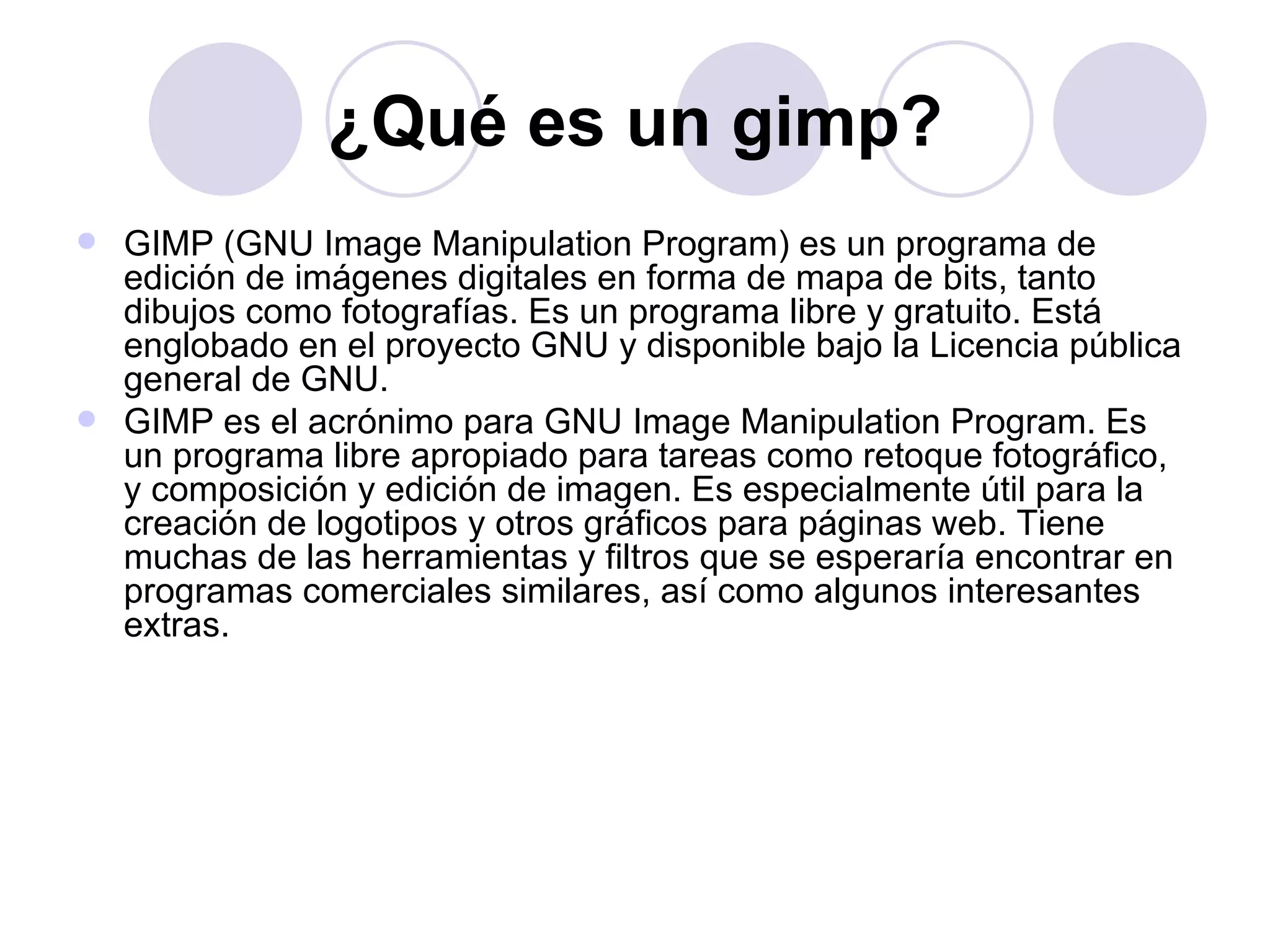 GIMP es un programa libre de edición de imágenes digitales que permite tareas como retoque fotográfico y creación de gráficos, siendo una alternativa gratuita a Photoshop. Soporta múltiples formatos de imagen y ofrece herramientas de automatización mediante macros y plugins. El documento también incluye instrucciones para la descarga, instalación y primeros pasos en el uso del software.