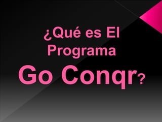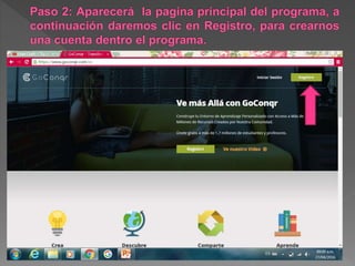 El documento es un tutorial elaborado por Paola Ortega Ruiz que presenta el programa Go Conqr, una herramienta gratuita para crear mapas mentales y otros recursos de aprendizaje. Se describe cómo utilizar la plataforma para organizar información, mejorar la comprensión y facilitar el estudio. Además, se destacan las diversas funcionalidades que permiten a los usuarios personalizar su experiencia de aprendizaje y colaborar con otros.
