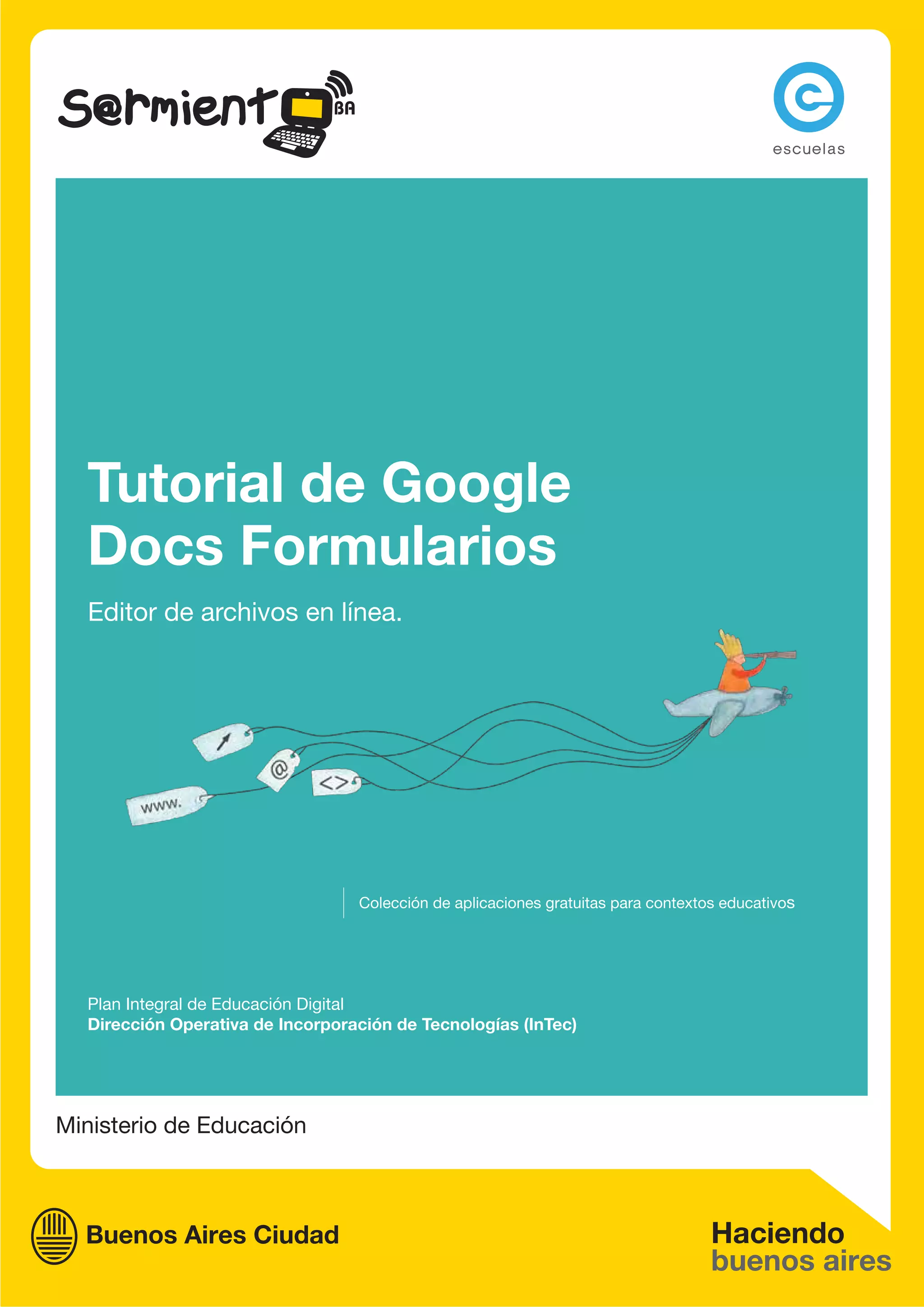 Este documento presenta una guía sobre cómo crear y utilizar formularios en Google Docs. Explica que los formularios permiten recopilar datos de los usuarios de forma sencilla y pueden usarse para encuestas, bases de datos y más. Luego detalla los pasos para crear un formulario, agregar elementos como preguntas de texto, casillas de verificación y listas desplegables, y distribuirlo por correo electrónico o insertarlo en una página web. Finalmente, incluye consideraciones pedagógicas y ejemplos de actividades educativas que pued