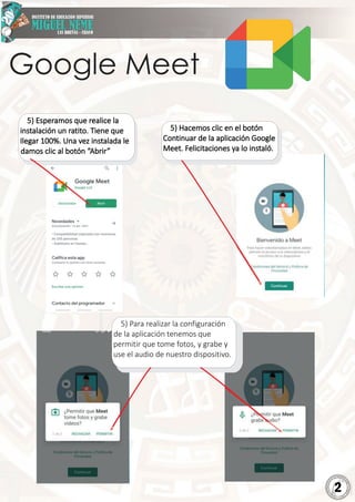 Google Meet es un servicio de videotelefonía desarrollado por Google, lanzado inicialmente como servicio comercial y luego para usuarios gratuitos. El documento incluye un tutorial sobre cómo descargar la aplicación en dispositivos móviles y PC, así como instrucciones para unirse a reuniones utilizando códigos o invitaciones. Además, se mencionan configuraciones recomendadas para una mejor experiencia durante las reuniones.
