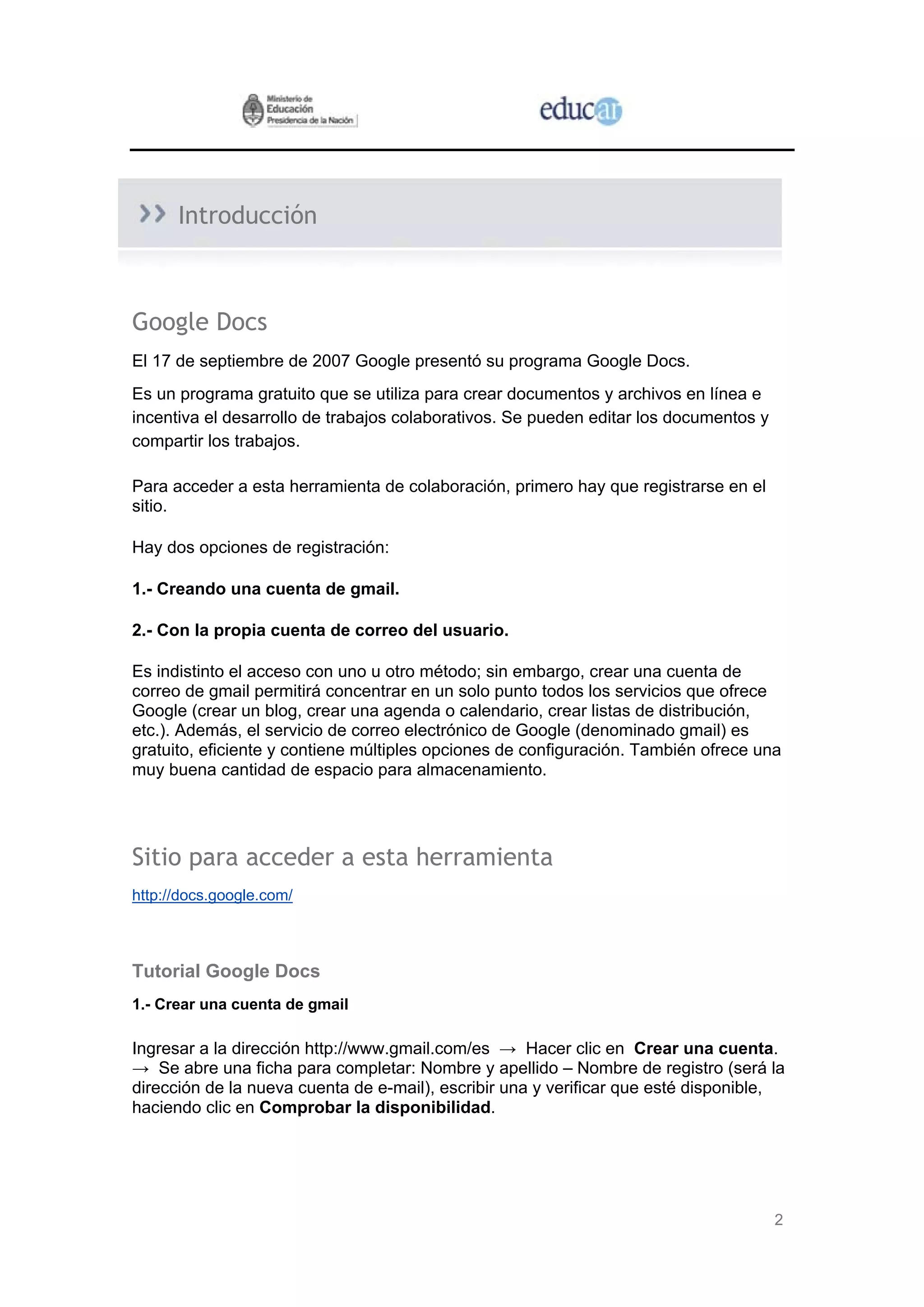 Este documento presenta Google Docs, un programa gratuito para crear y editar documentos en línea de forma colaborativa. Explica cómo crear una cuenta de Gmail o usar una cuenta de correo existente para acceder a Google Docs, y cómo crear, subir, editar y compartir documentos en la plataforma de manera sencilla. También cubre características como editar documentos desde cualquier lugar, almacenar trabajos de forma segura en la nube, y organizar documentos en carpetas.