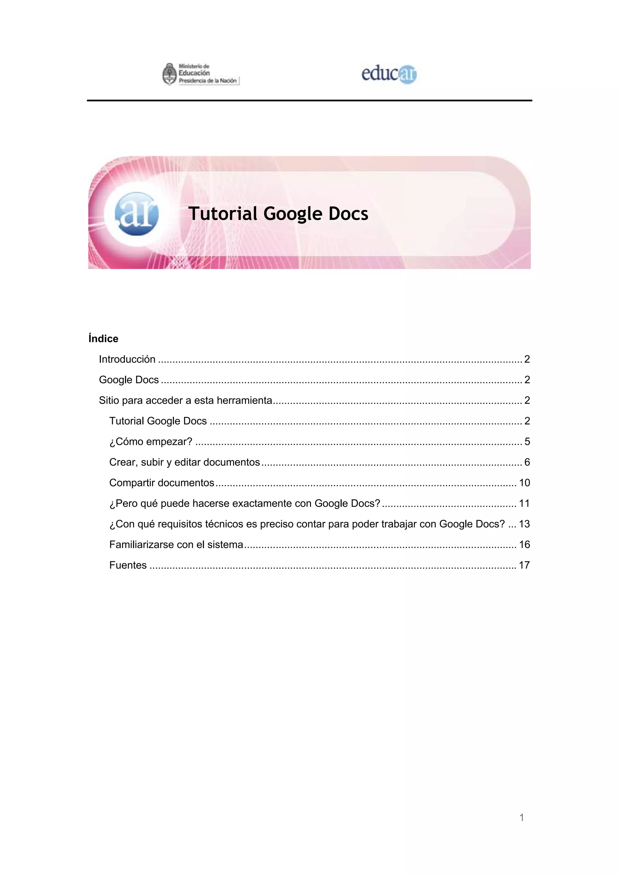 El documento es un tutorial sobre Google Docs, una herramienta gratuita de creación y edición de documentos en línea que permite trabajos colaborativos. Describe cómo registrarse, crear y editar documentos, compartirlos y organizarlos, así como los requisitos técnicos y limitaciones de uso. También se detallan las funcionalidades específicas para documentos, hojas de cálculo y presentaciones.