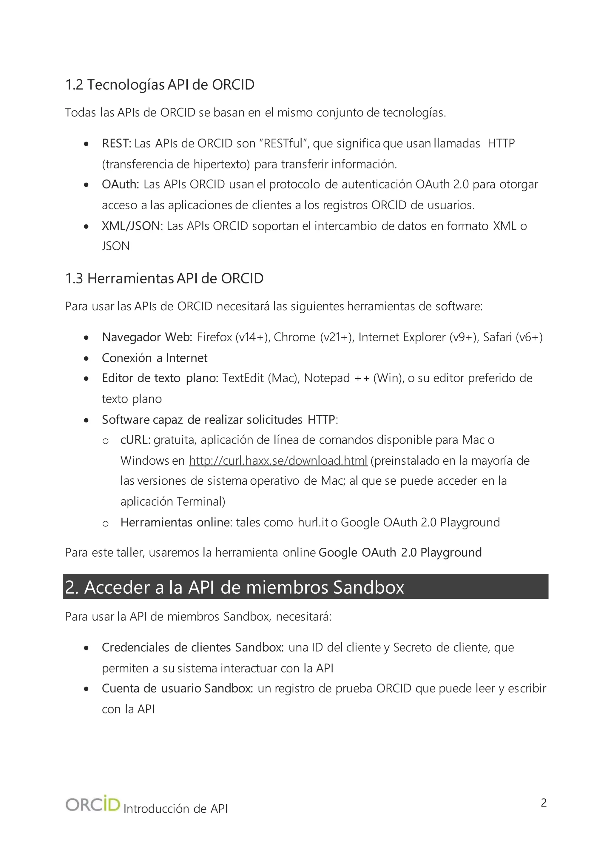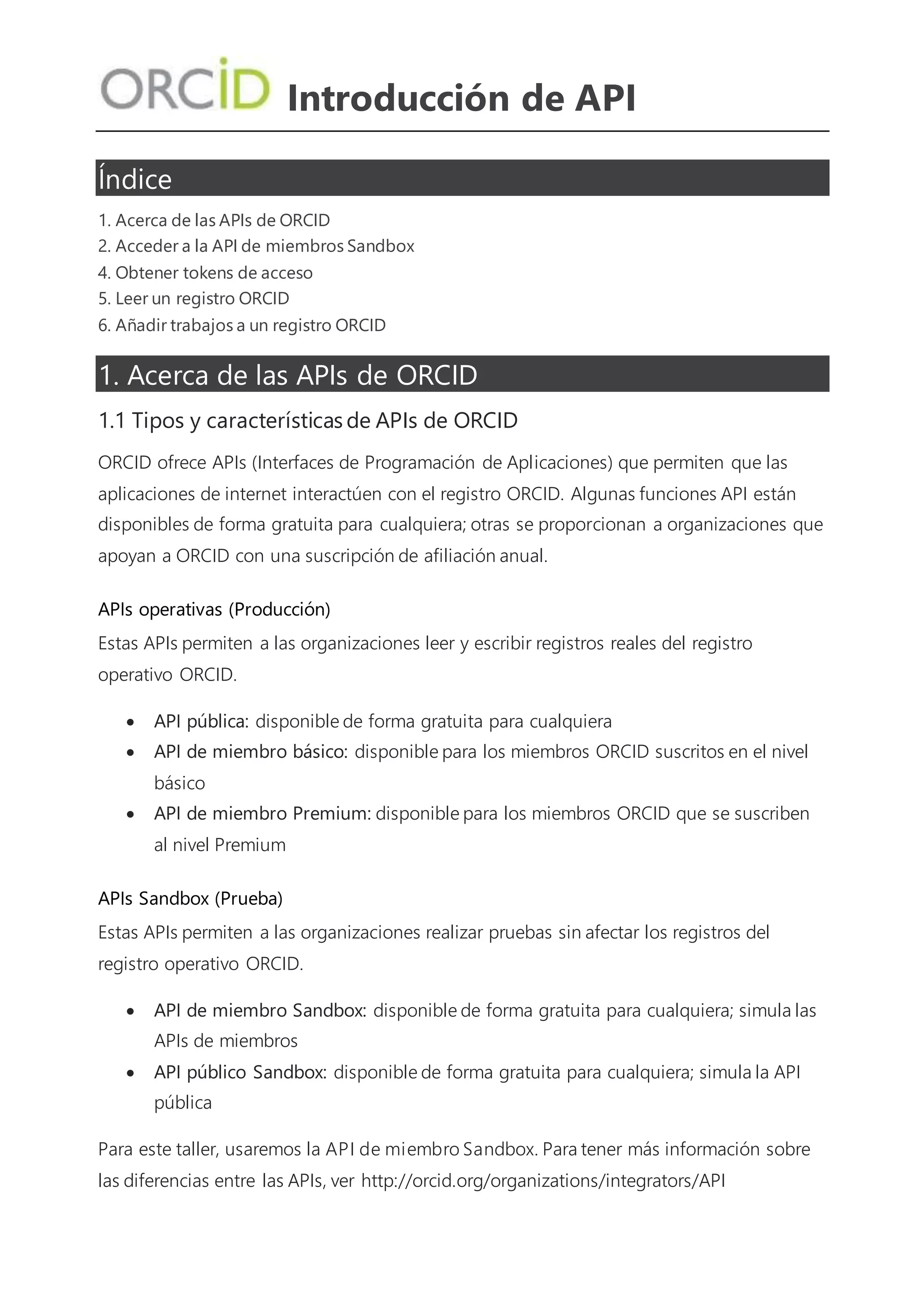El documento describe las APIs de ORCID, incluyendo su acceso, características y cómo interactuar con ellas utilizando un entorno de pruebas (sandbox). Se explican los procedimientos para obtener credenciales de cliente, generar tokens de acceso, y realizar operaciones como leer y añadir trabajos a los registros de ORCID. Además, se presentan herramientas necesarias y se da un enfoque práctico utilizando Google OAuth 2.0 Playground para la autenticación y operaciones de API.