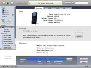 El documento explica cómo descargar e instalar iTunes, una aplicación gratuita de Apple para organizar y reproducir música, videos y fotos en un ordenador y mantenerlos sincronizados con dispositivos móviles de Apple. Una vez instalado, iTunes permite acceder a la tienda iTunes Store para comprar contenido digital y almacenar y reproducir archivos multimedia en la biblioteca de iTunes.