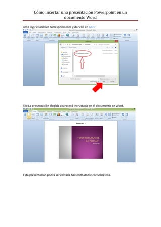 Para insertar una presentación PowerPoint en un documento de Word, hacer clic en Insertar > Objeto > Crear desde un archivo, buscar y seleccionar la presentación de PowerPoint, y esta aparecerá incrustada en el documento de Word para poder ser editada.
