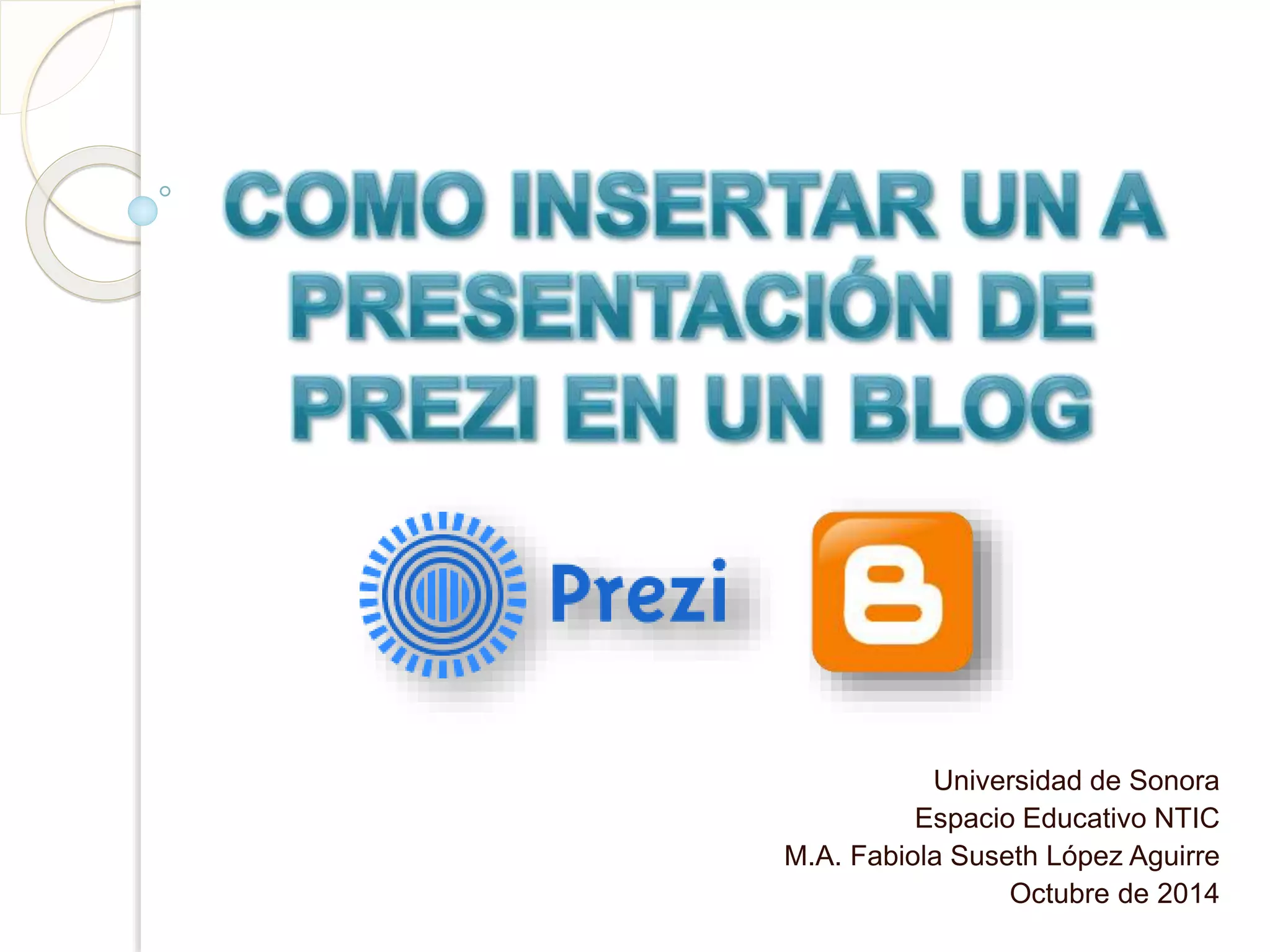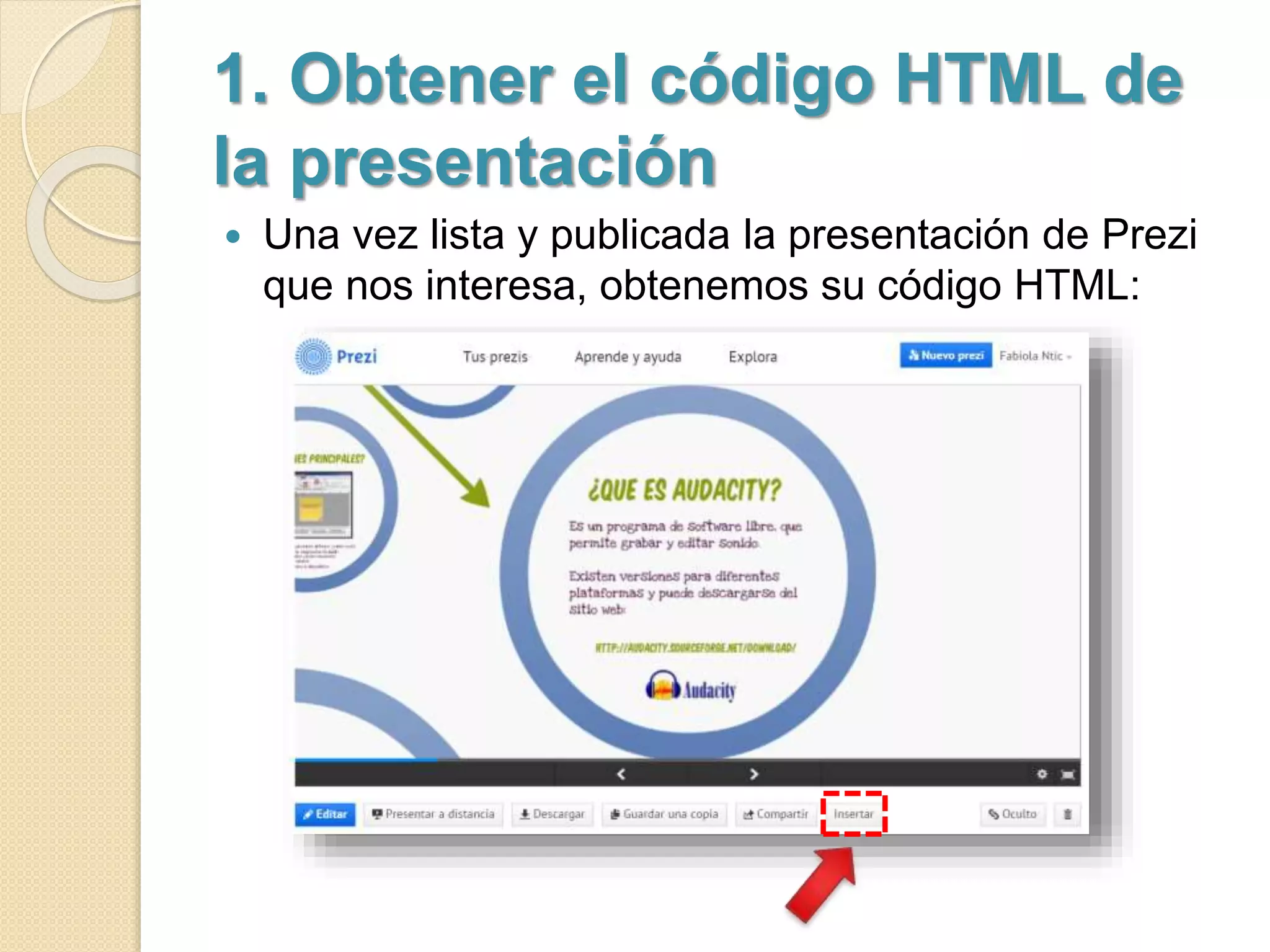 Este documento describe cómo insertar una presentación de Prezi en un blog. Explica que primero se debe obtener el código HTML de la presentación de Prezi y copiarlo. Luego, en una nueva entrada del blog, se cambia al modo de edición HTML, se pega el código copiado y se publica la entrada, lo que permitirá reproducir la presentación directamente desde el blog.